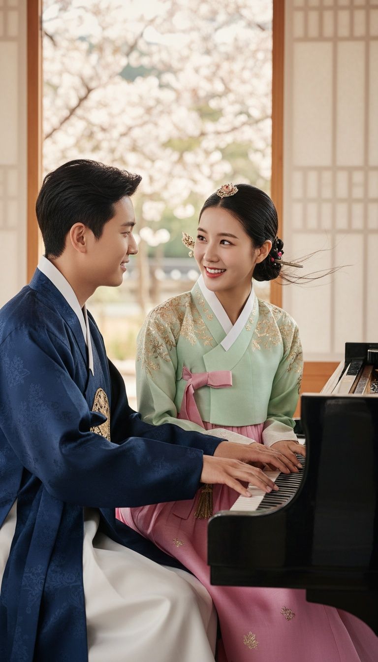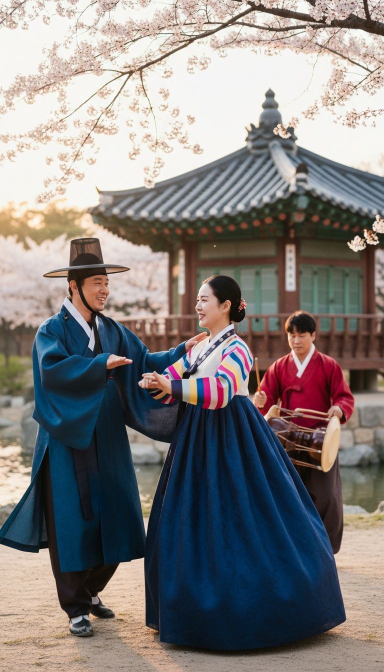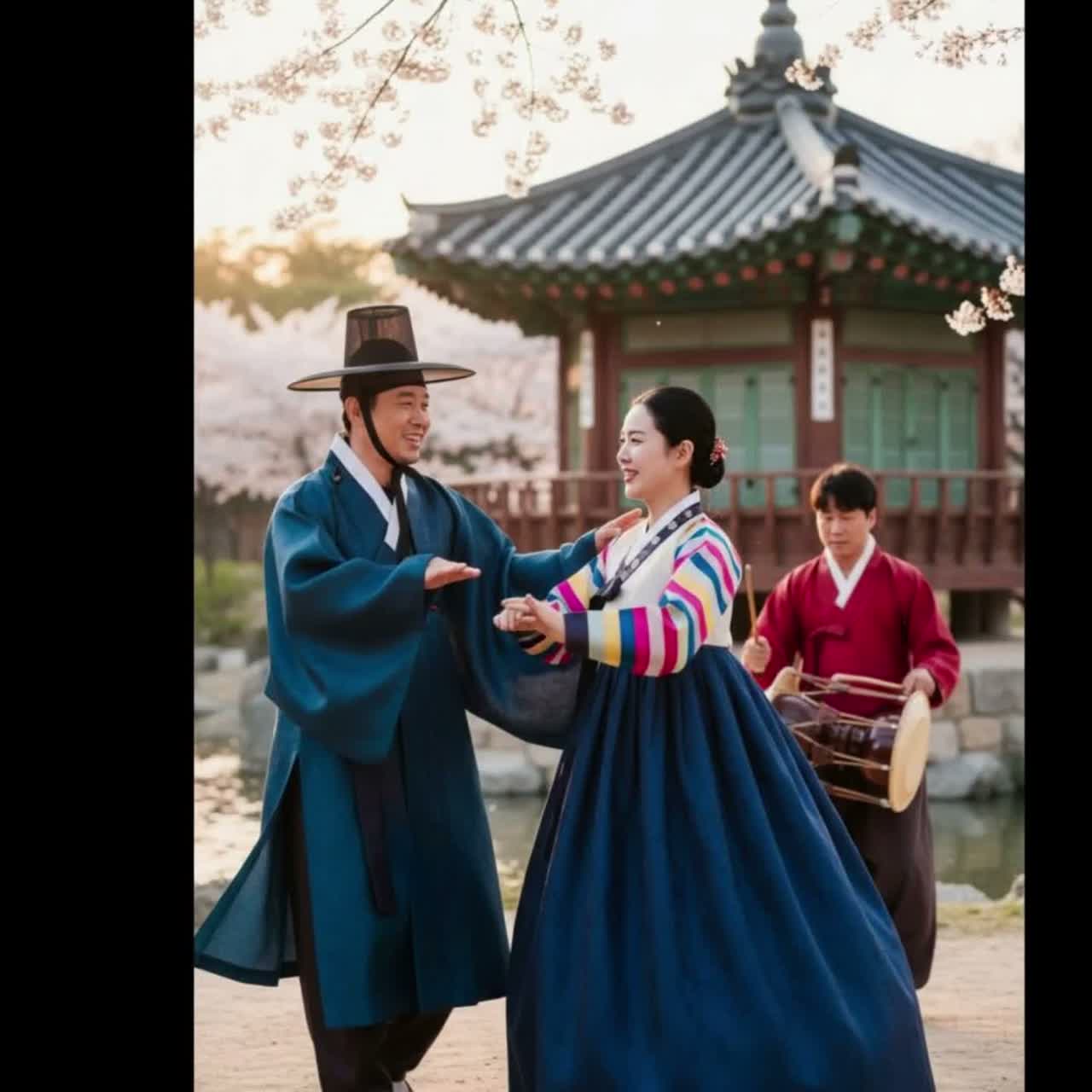 A Korean traditional fusion track in 12/8 launches with rugged drum and janggu rhythms, anchoring the groove, Distorted gayageum and geomungo unleash bluesy riffs, intertwining with lively pipa and soaring tungso, Pansori-style male and female vocals trade vibrant, dynamic passages as janggu solos heighten tension, Masterfully blended production merges raw energy and elegant traditional timbres for a powerful, sophisticated sound