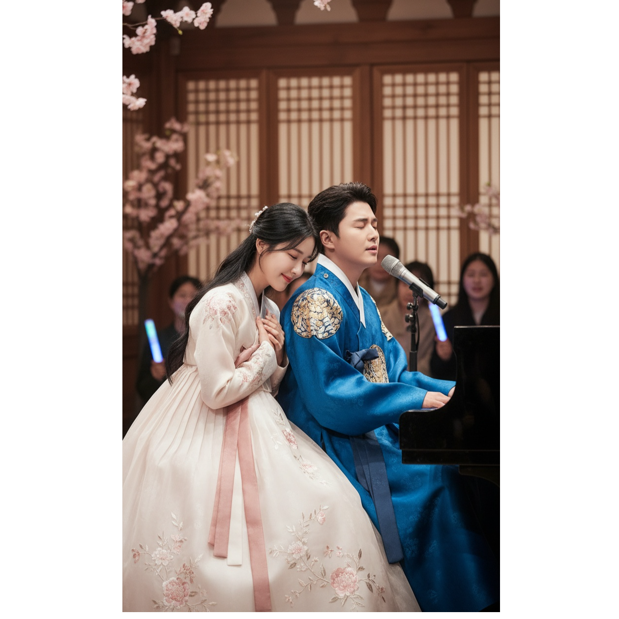 The song based on traditional Korean traditional music begins with a lead by a drummer and a solo drum, followed by a mystical atmosphere on the Daegeum, The janggu, kkwaenggwari, and sogo dynamically blend together, and the taepyeongso leads the lyrical melody, The woman sings delicately with a falsetto voice close to the head, and the gong is responsible for the low-pitched resonance, adding diversity to the harmony by the gayageum quartet, creating a rich timbre, After a dramatic climax where passionate vocals and traditional instruments harmonize, a dazzling ensemble creates an impressive finish