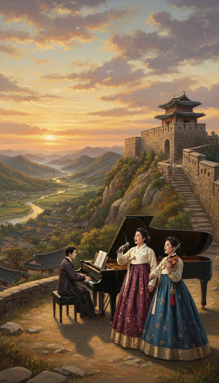 Traditional Korean folk song structure opens with a solo drum rhythm invoking "Eolssigu Jeolssigu, " joined by janggu, kkwaenggwari, sogo, layering lively percussive textures, Taepyeongso weaves in a lyrical melody while a female head voice floats above, delicate yet strong, Gong adds a subtle, resonant undercurrent, A gayageum quartet colors the harmonies and melodies, enriching the texture, The song builds to a dramatic climax—vocals and instruments in passionate interplay—culminating in a vibrant, dazzling ensemble close