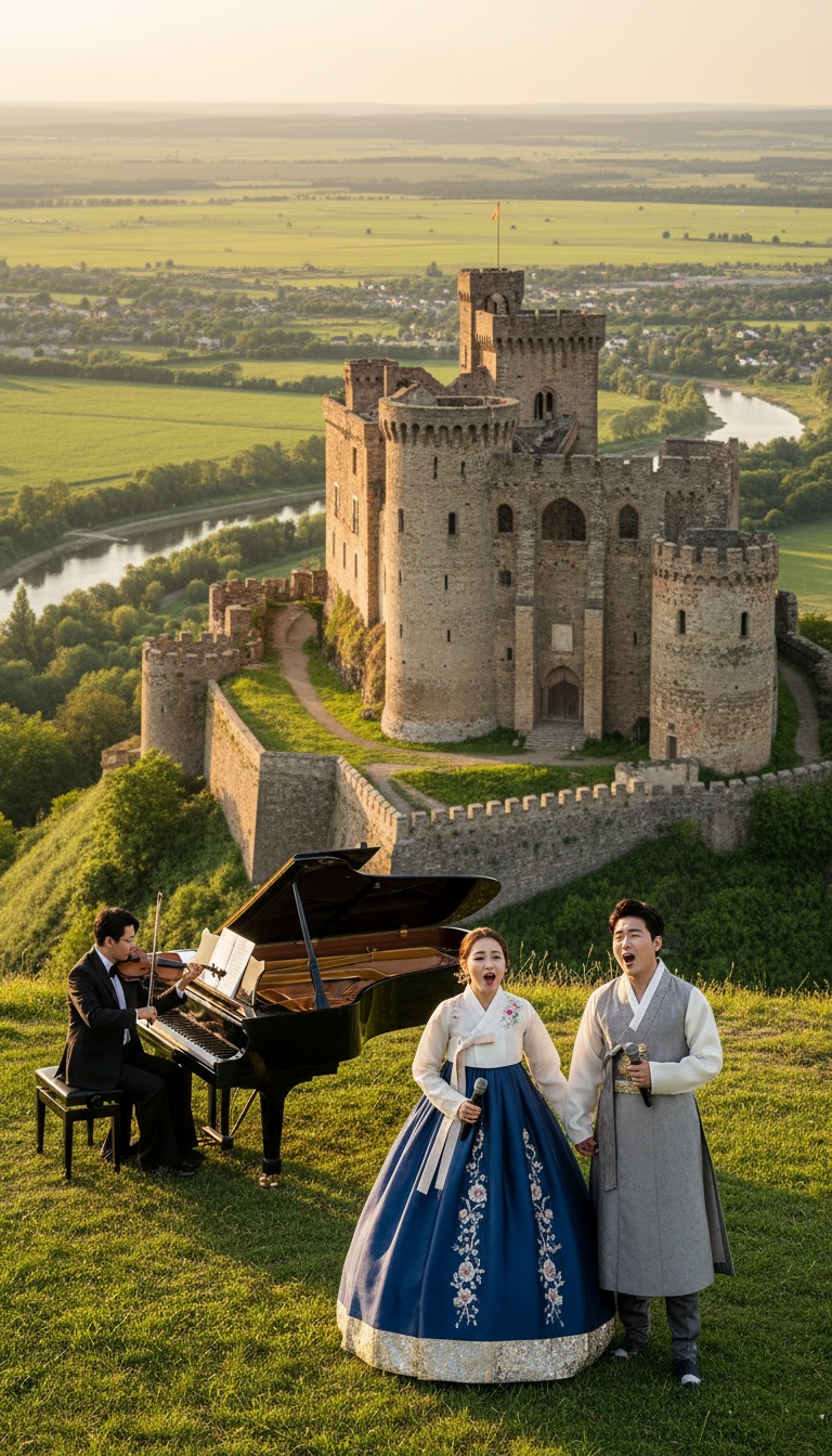 A Korean trot song in 2/4, powered by crisp, expressive vocals, rides a buoyant groove with syncopated percussion and bright bass, Lively violins weave countermelodies, while pan flute and woodwinds add vibrant tonal character, Each section is distinct, dynamic, and propulsive