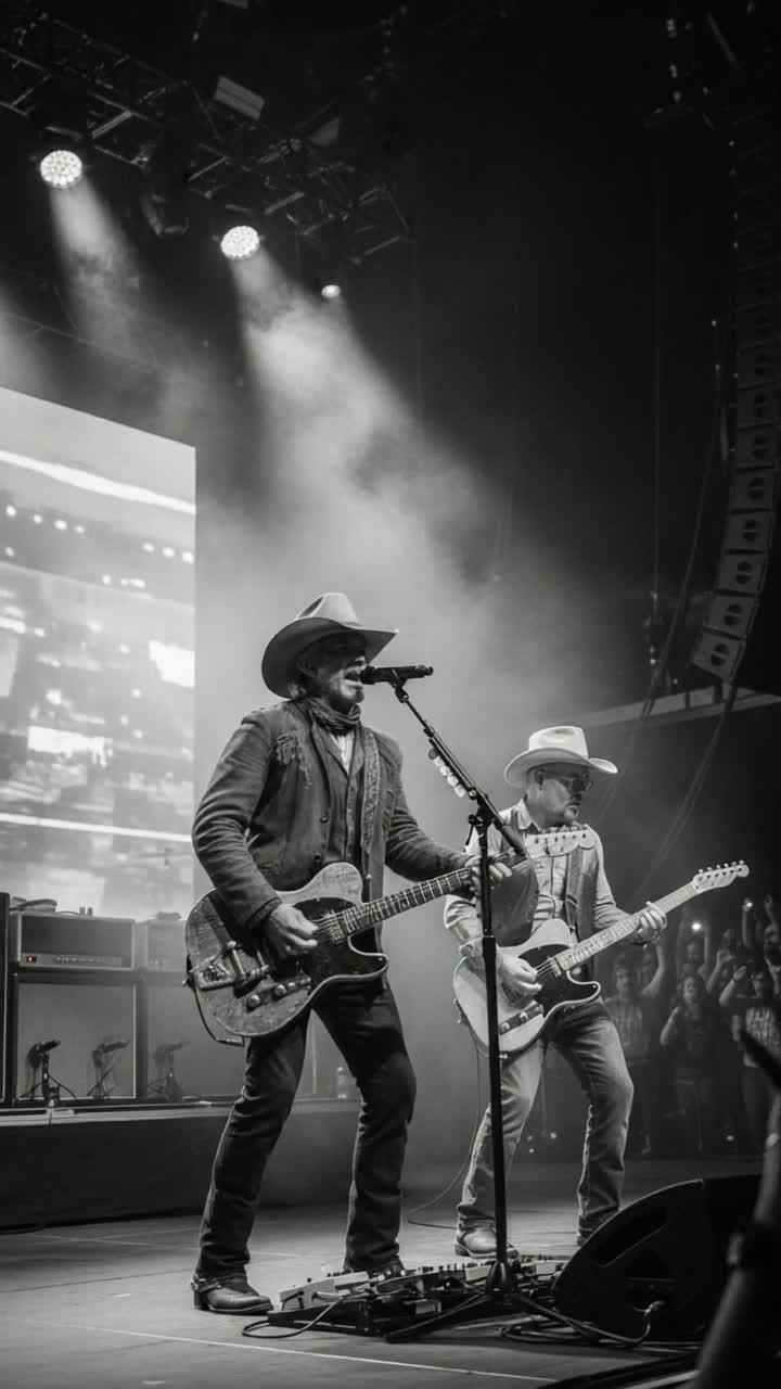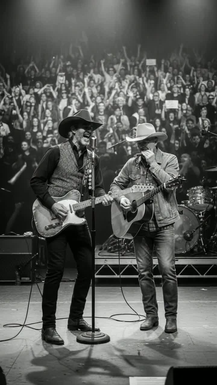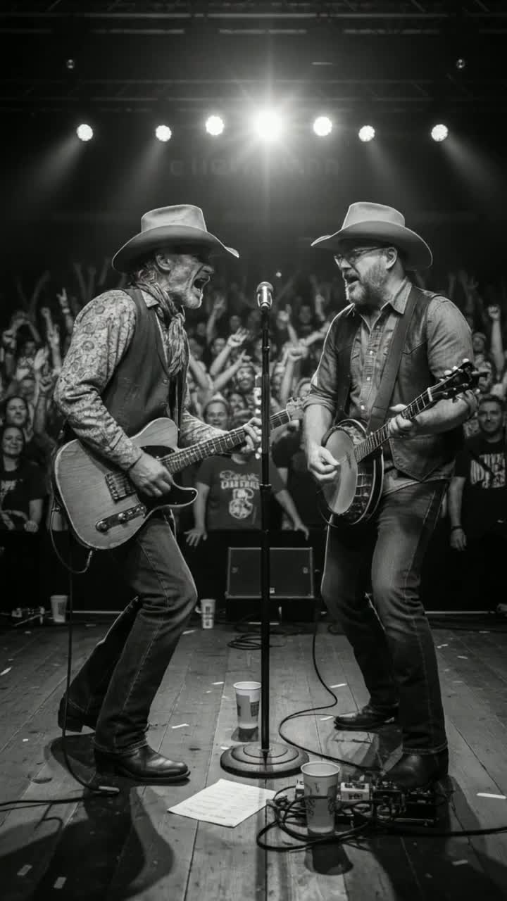 Live concert recording, high-energy Country-Rock, Cowpunk, Hard Rock influence, Distorted electric guitars, heavy driving drums, rowdy crowd noise, stomping rhythm, Duet between two gritty, raspy male voices (Singer A and Singer B), High energy, 155 BPM, Structure: Intro with crowd chanting, spoken dialogue, alternating verses, anthemic harmonies in chorus, wild guitar solo, big finish