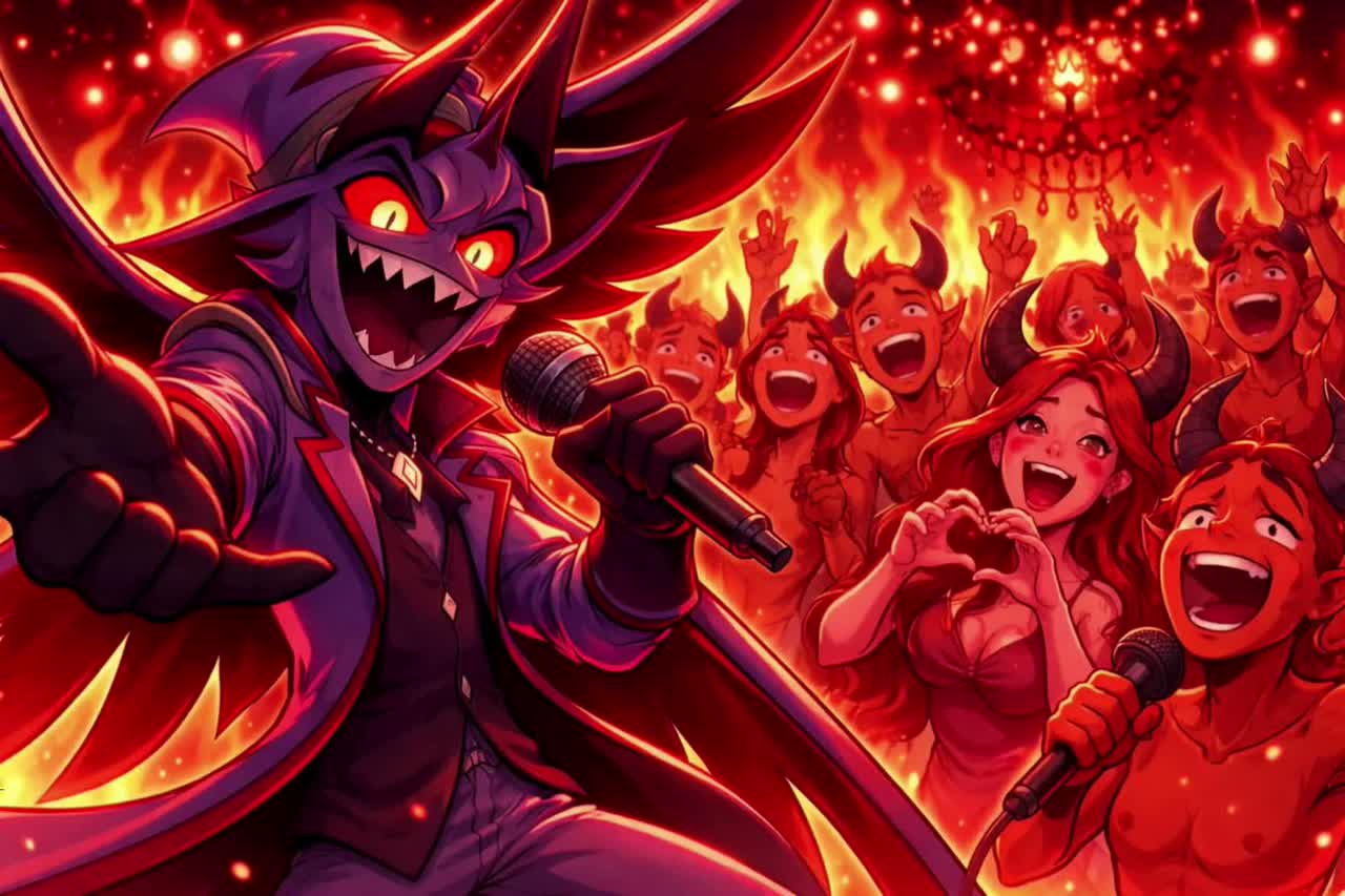 Dark Pop, Rock Opera, Grand, theatrical, swagger-heavy, Dramatic orchestra hits, distorted guitars, slick cabaret-style rhythm, devilish flair, Think: powerful belting, sharp attitude, charismatic villain energy, Young male – smooth low register with falsetto lifts, sly snarls, and venomous whispers