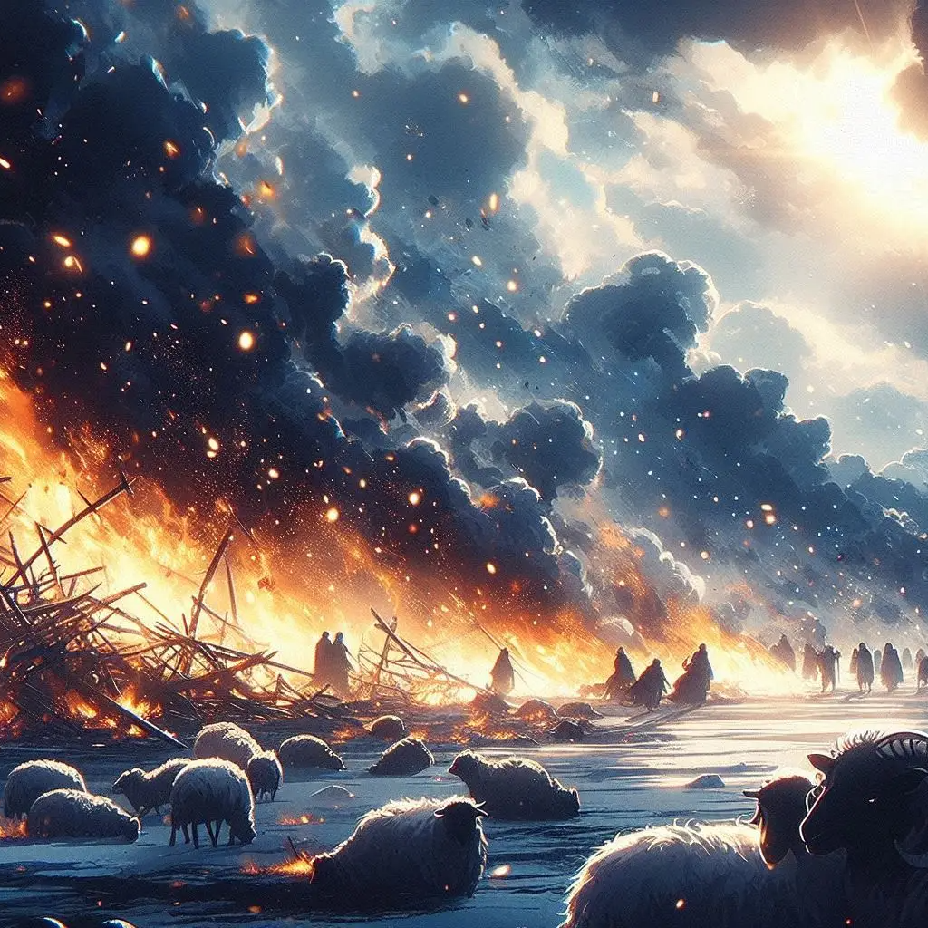 dark epic biblical ballad, cinematic orchestral, male & female vocals, emotional choir, slow tempo 70 BPM, D minor to F major, taiko drums, harp, cello, prophetic tone, Book of Amos, justice, divine judgment, repentance, restoration, Hebrew prophetic poetry