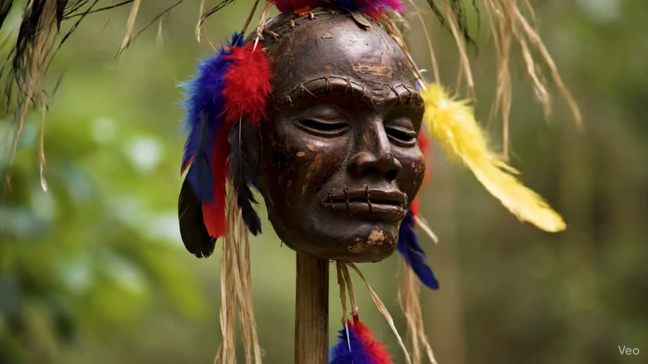 percussion-heavy tribal music with flutes and layered male vocals