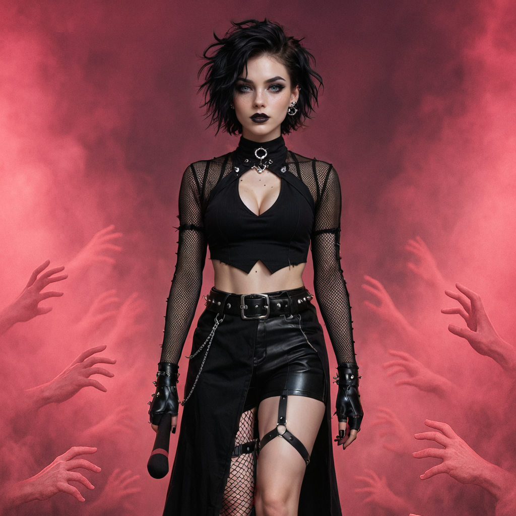 female vocals, dark alt pop, sarcastic attitude, confident and witty tone, gritty electronic texture, chant-like rhythmic chorus, subtle vocal fry, emotionally clever delivery, off-mic spoken word interlude, rhythmic bridge with spoken-word intensity, distorted layered chorus climax, cinematic dark pop instrumentation with gritty electric guitar and glitch effects