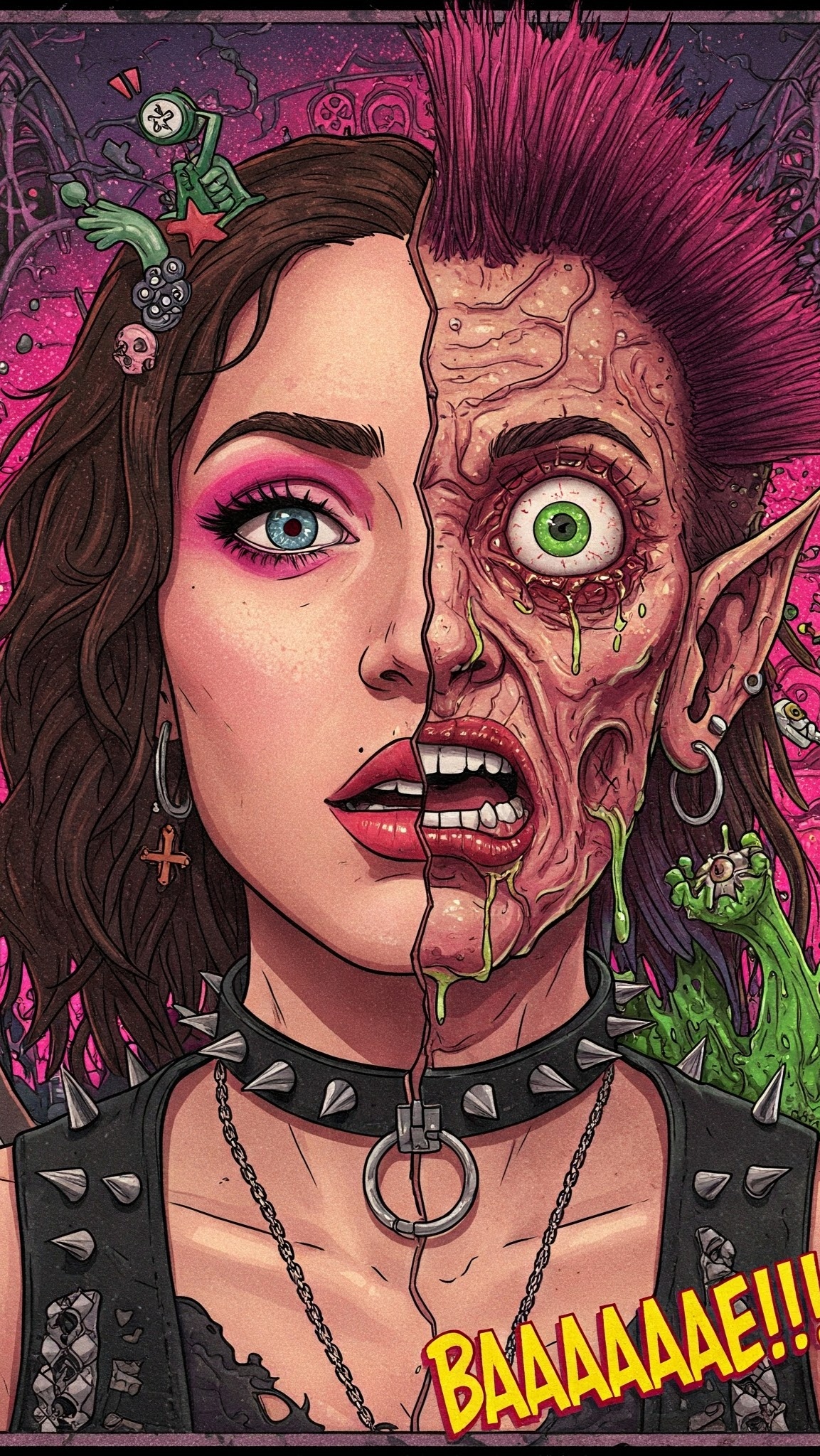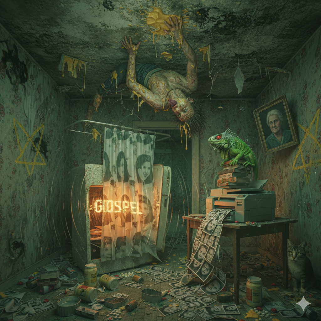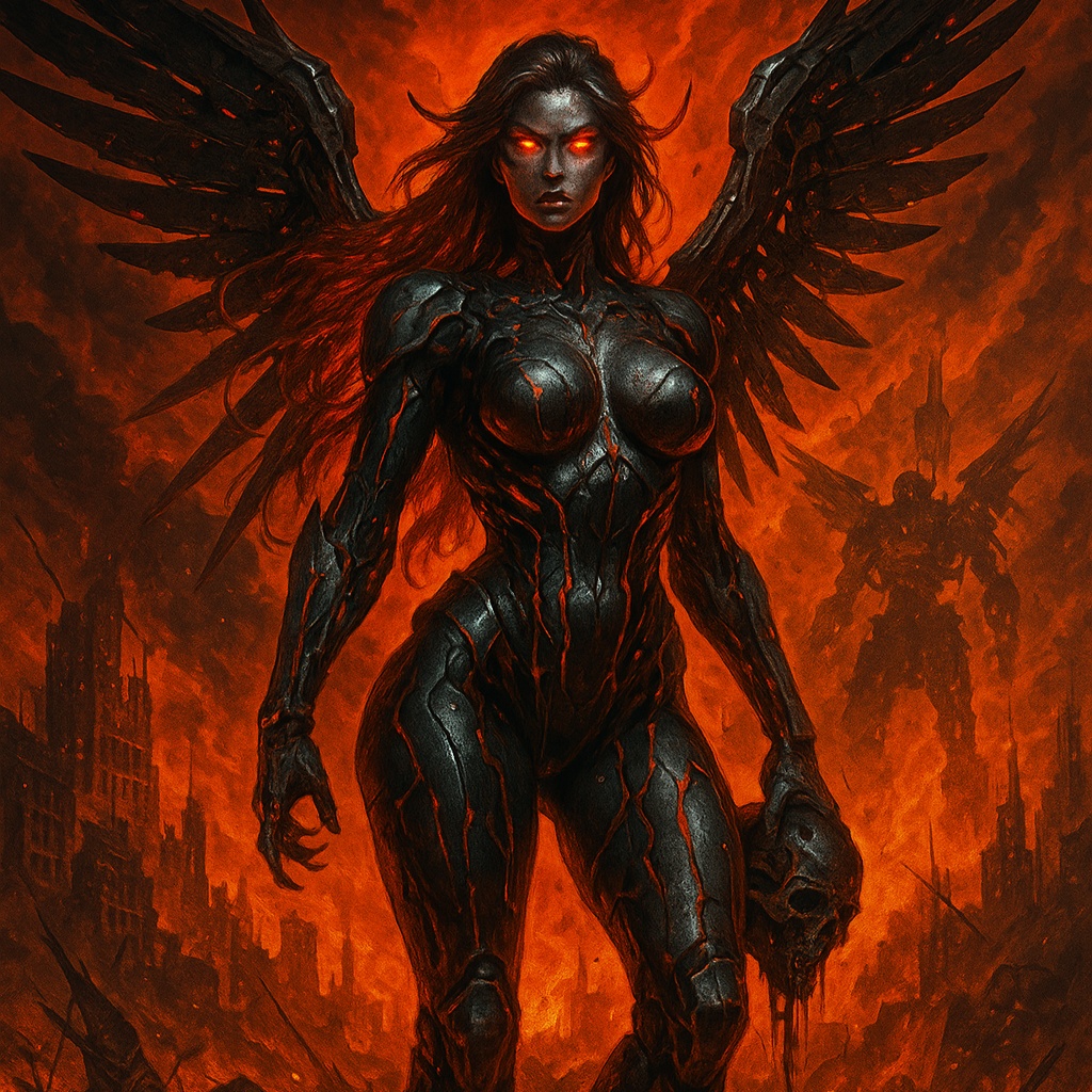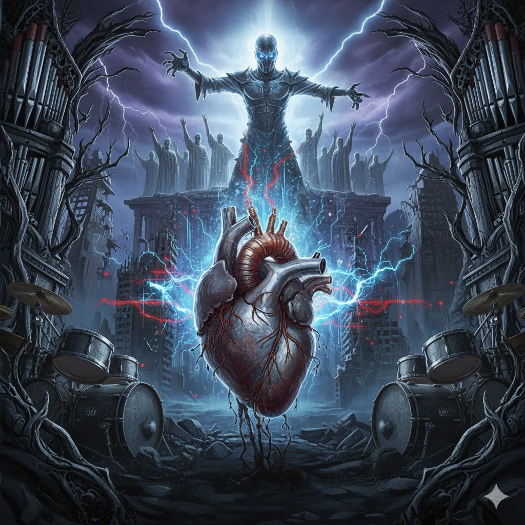 Unleashing relentless Death Metal fused with Blackened and Dissonant Death Metal, the track pummels through tempo-shifts and polyrhythms, layering blastbeats, brutal half-time slams, and deep cavernous reverb, Guttural lows, shrieking highs, whispered demonic doubles, and pitch-shifted growls twist with ritualistic doom, seismic bass drops, and eerie, choir-like gang chants for a suffocating, immersive assault