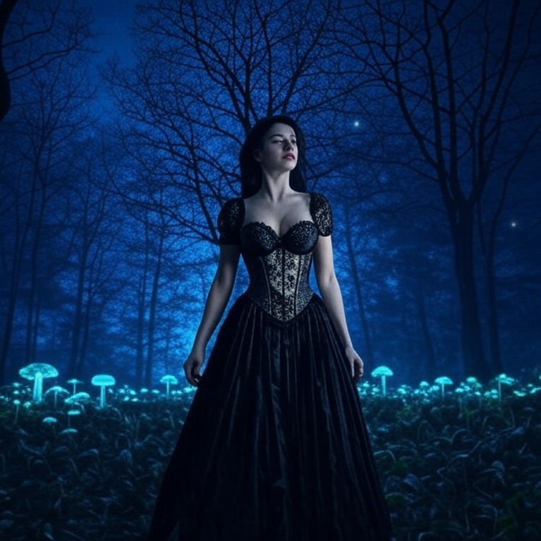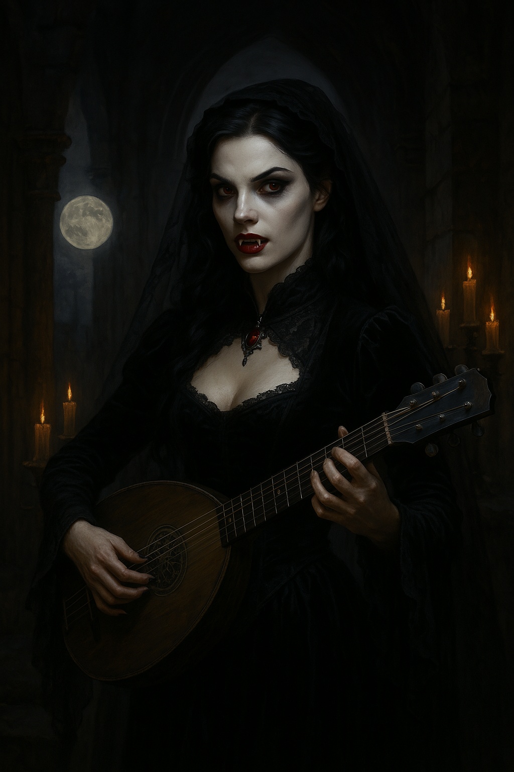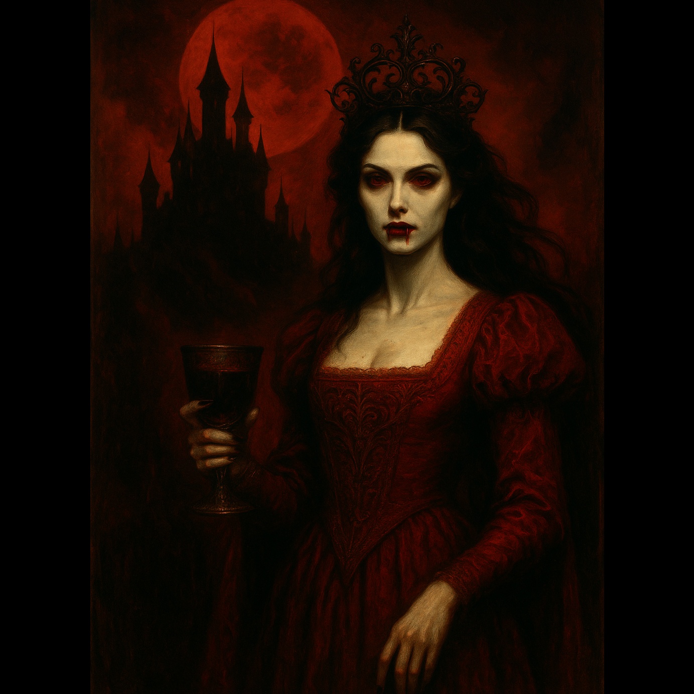 Begin with a dark orchestral intro: pipe organ, harpsichord, and choral textures swirl into crushing Baroque Gothic Metal riffing, Medieval strings entwine with thunderous doom-laden drums under soaring, operatic female vampyre vocals, Epic punk-infused guitar surges drive the chorus, interspersed with cathedral bells, gregorian chants, and dramatic tempo shifts evoking a sense of ritualistic grandeur and haunting romance, The arrangement weaves between brooding waltz passages and explosive rock crescendos, delivering a grand, horror-tinged symphonic ballad