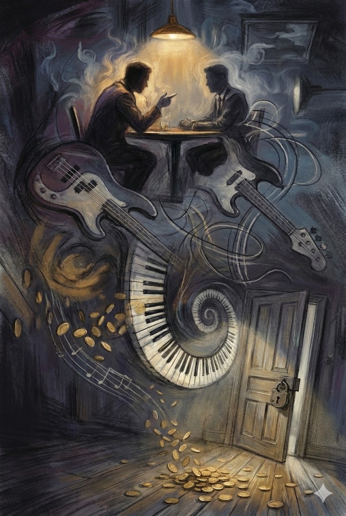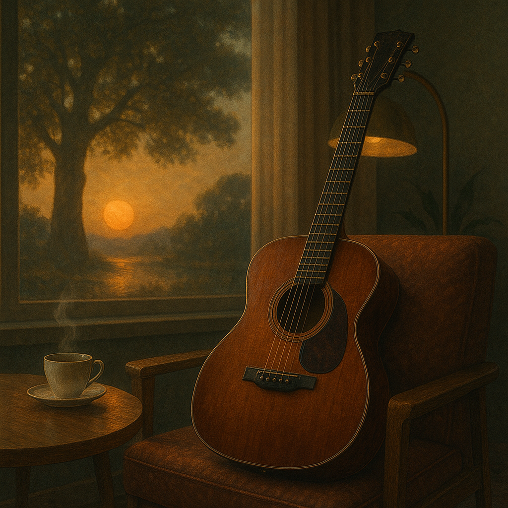 The track opens with clean electric guitar playing laid-back bossa nova chords, layered over a smooth, flowing bassline and soft jazz fusion drums, Retro '60s keys subtly weave through the mix, creating a mellow, cinematic atmosphere, Ambient pads add depth, while catchy melodic motifs give the chilled lounge vibe a stylish, relaxing touch