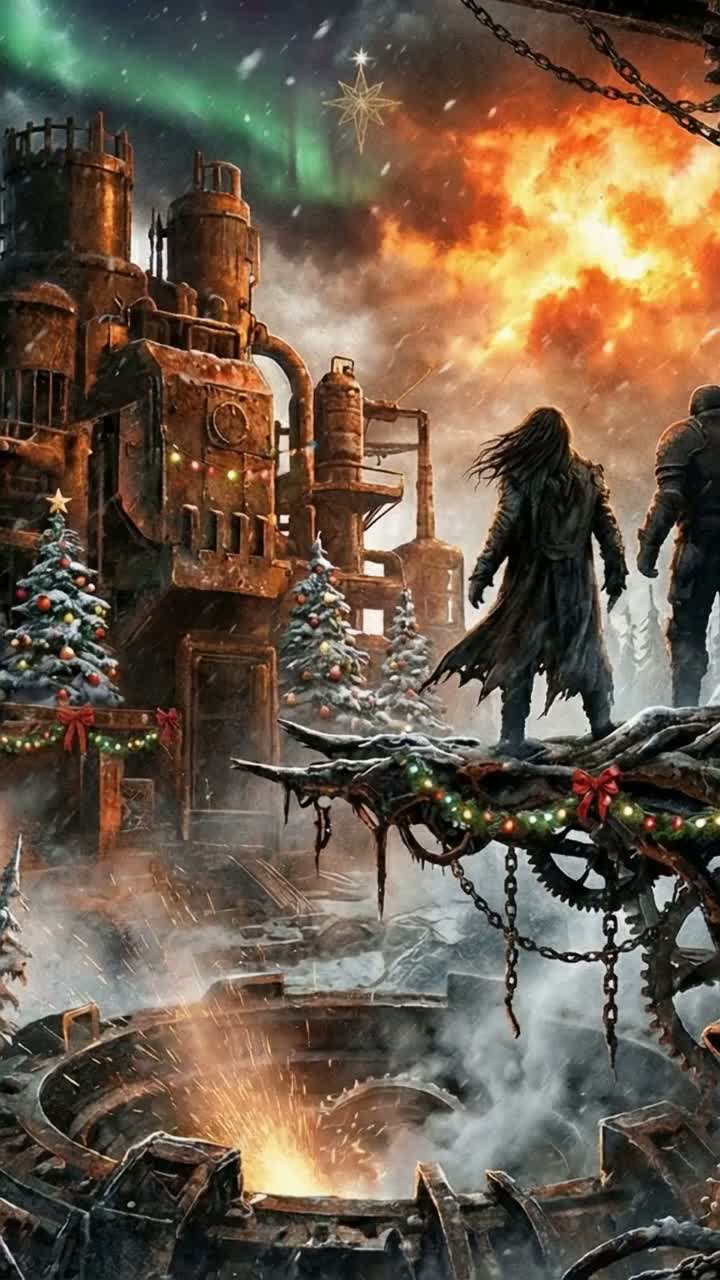 An explosive death metal banger fuses relentless double-kick drums with gnarly, drop-tuned guitar riffs, Mechanical industrial sounds grind beneath wild, festive chimes and sleigh bells, Two vocalists duet—one with guttural screams, one higher pitched—creating infectious, chaotic hooks