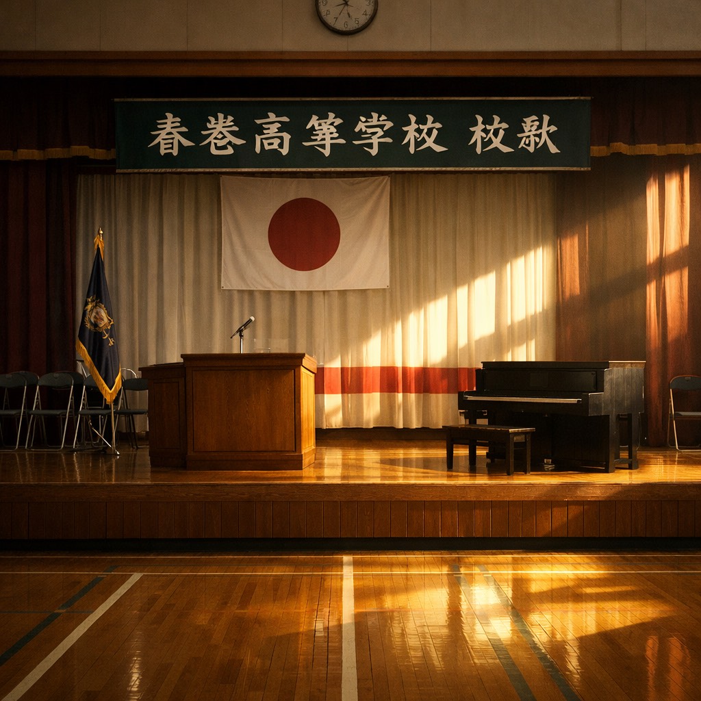 Traditional Japanese school song structure for "Springrolls High School", 88 BPM, D major, Military march-influenced rhythm but performed on solo piano only, Strong left-hand octave accents on beats 1 and 3, Right hand full chordal support, firm and dignified tone, Clear unison choir melody (no solo voice), Formal, upright, serious graduation atmosphere, No pop elements, No show tune character, No theatrical dynamics, No orchestral expansion, springrolls is a proper noun referring only to the school name