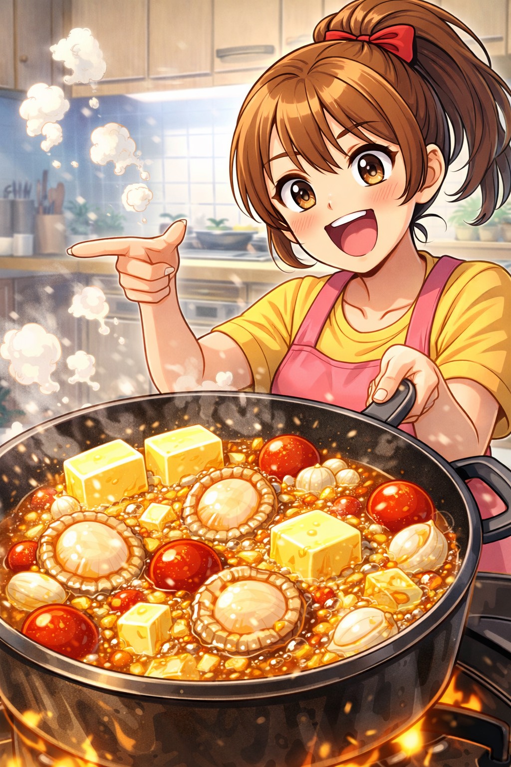 Cute Chaotic Cooking-Show Pop, 144–148 BPM, Bright Major Key, Female Vocal, cute, bright, energetic, playful, slightly unhinged, Smiling cooking-show host energy with dangerous enthusiasm, Clear articulation, forward delivery, bouncy rhythm, lively phrasing, light idol-like charm, Verses talk-sung and fast-moving, Spoken parts should still be sung naturally in one flowing line, Hooks bold, hyped, and crowd-pumping, Choruses catchy, punchy, adorable, and slightly insane, Cute delivery, reckless butter-fueled confidence, Fun, colorful, fast, and chaotic, Exclude Style