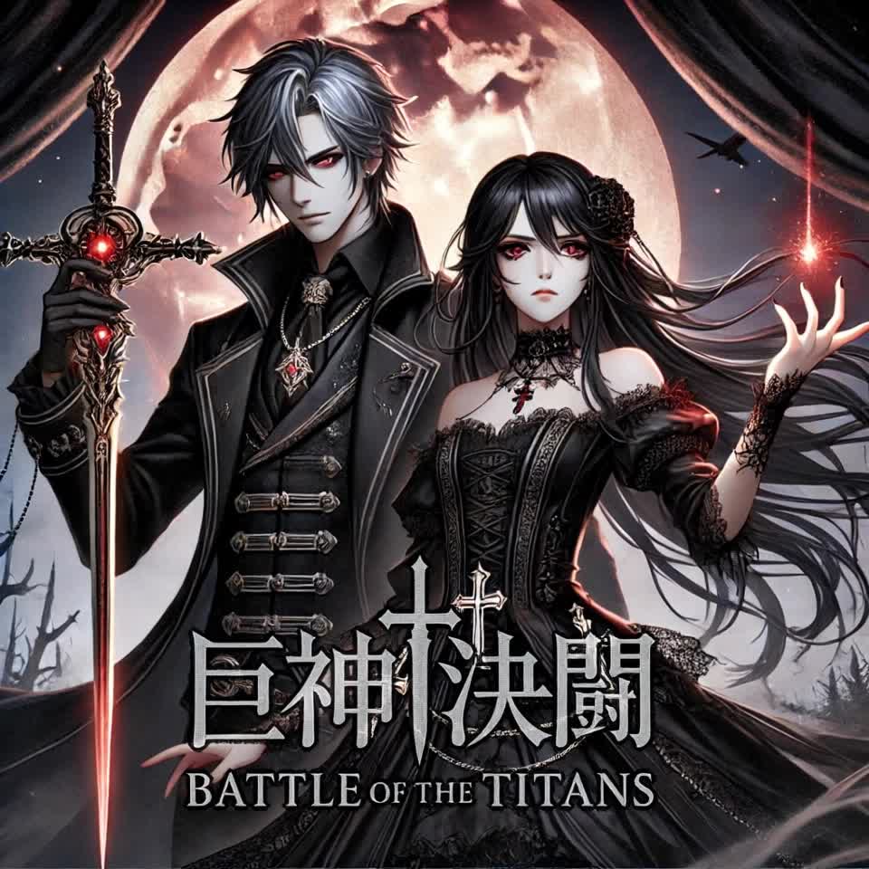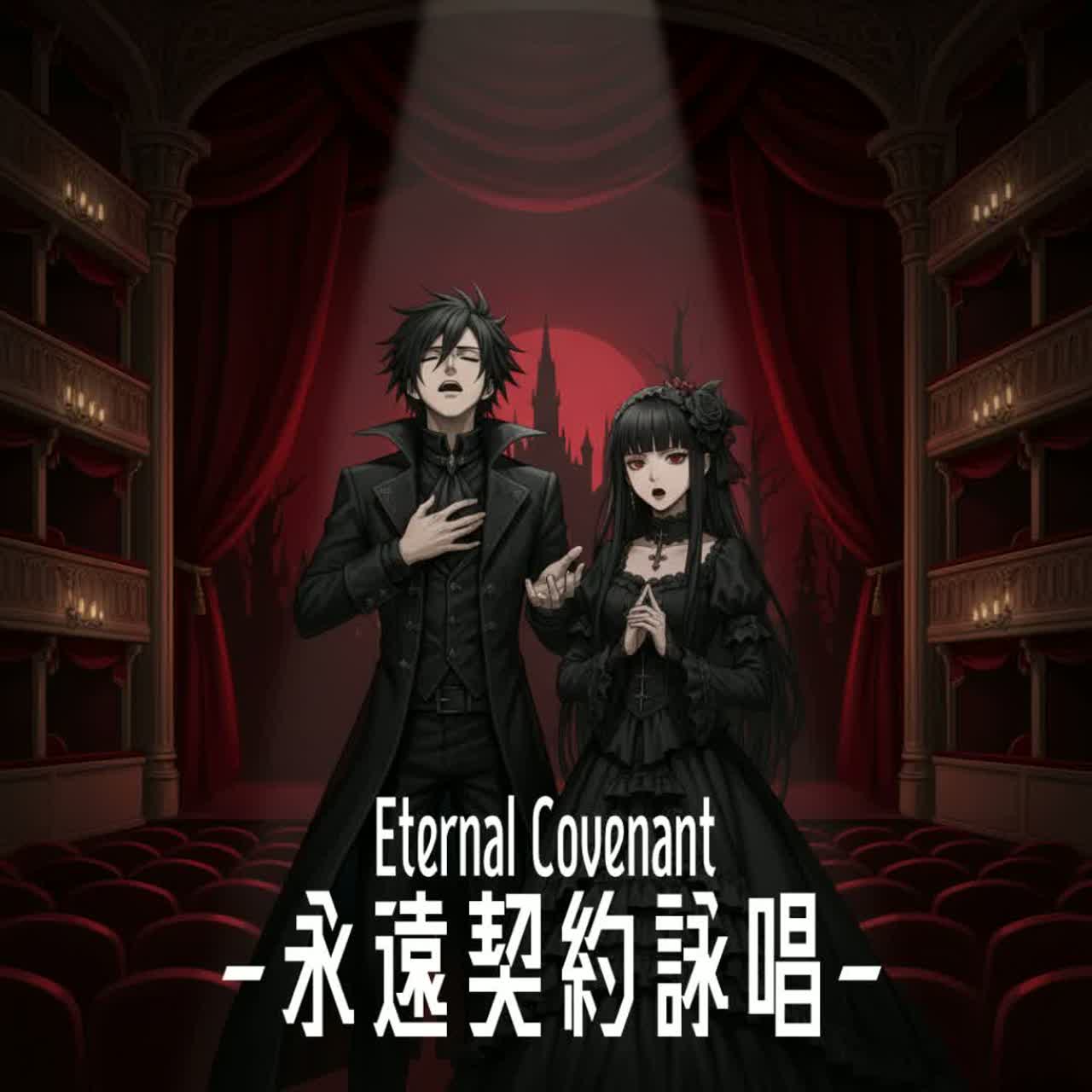 visual style J-pop, soft-rock, alternative-rock, piano, synthesizer, UNISON VOCAL, male and female vocal, dark fantasy, organ, orchestra, dark, rough voice, guiter riff, beatbox, nightcore