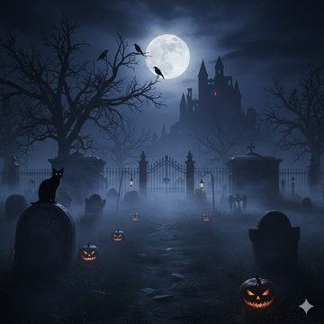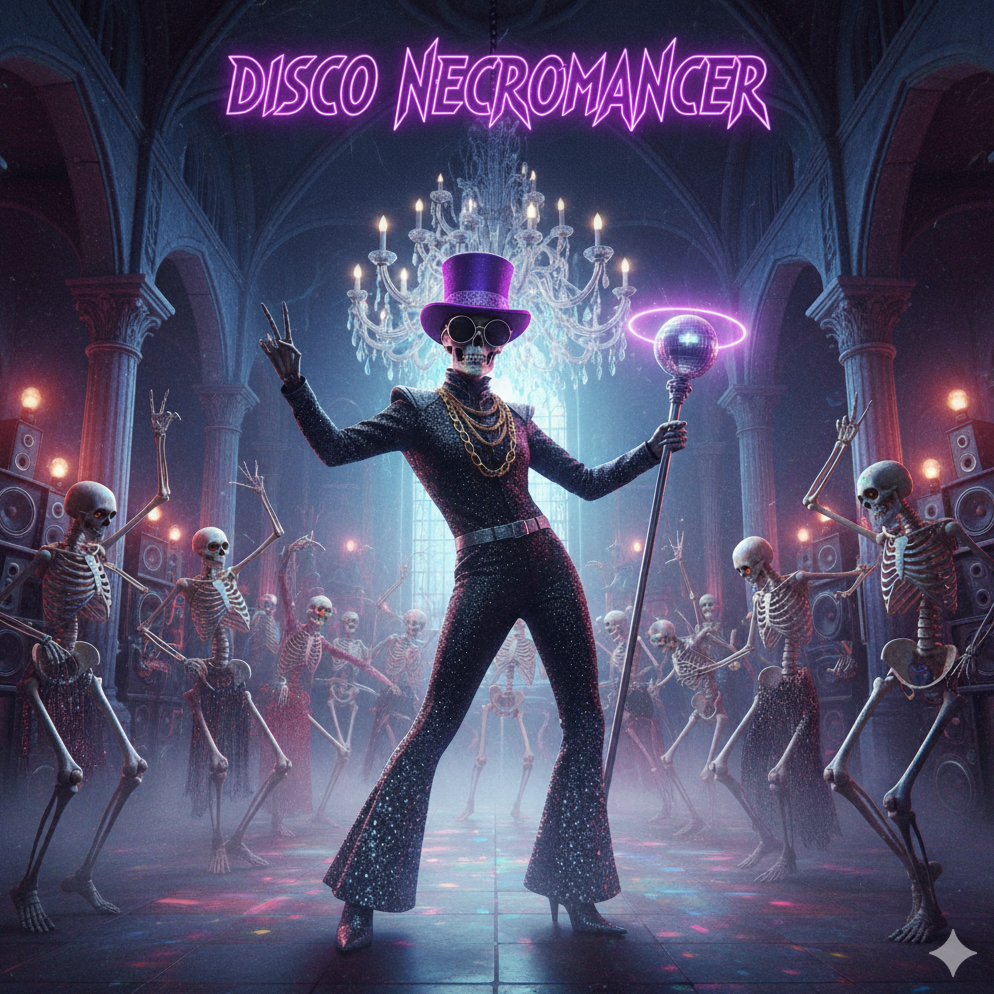 A funky, bass-driven Halloween disco track with dark synth undertones, retro drum machines, and slick rhythm guitar, Combine 70s disco flair with 80s synth-funk edge, The vibe should be playful but mysterious, with eerie sound effects (light thunder, whispers, reverb claps) and ghostly chorus echoes, Campy, seductive, spooky-fun - a Halloween disco anthem for adults, Equal parts groove and graveyard glamour, Confident, charismatic male lead vocal with a theatrical, tongue-in-cheek delivery, Add layered backing vocals that echo phrases or chant hooks like “raise ‘em up!” or “dance!” to enhance the ritualistic dancefloor energy, Tempo: around 115–120 BPM, Darkly funky and irresistibly danceable - a fusion of Halloween theatrics and disco heat, Imagine a neon-lit graveyard where the dead rise not to haunt, but to groove