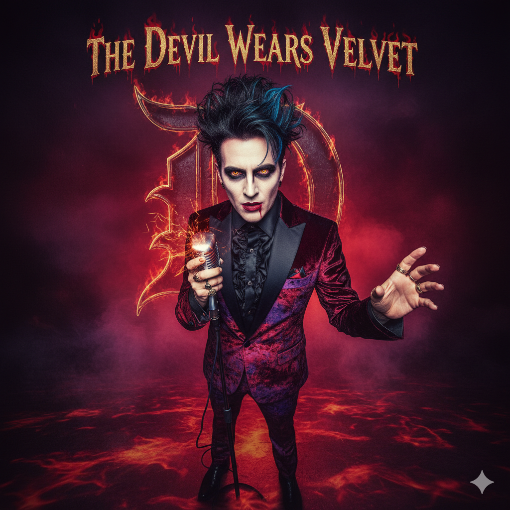 Create a darkly seductive Halloween glam rock / funk-rock song, The mood should be mysterious, dangerous, and sensual, Use a smooth but gritty male lead vocal with confident, tempting delivery and smoky charisma, Keep the tempo mid-paced (around 100–110 BPM) with a crunch rhythm guitar, a deep funky bassline, steady rock drums, and subtle organ or synth layers for atmosphere, The guitar solo is to be shredding with a wah-wah pedal effect, The tone should feel like red velvet, candlelight, and sin wrapped in groove