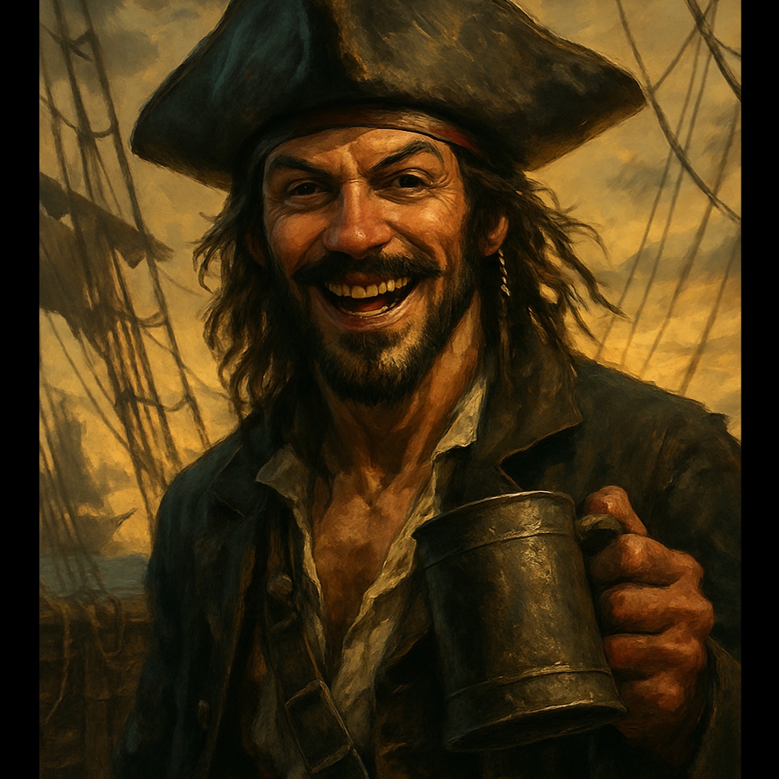 Lighten up pirate voice, dark pirate folk ballad with cinematic atmosphere and poetic storytelling, Male lead vocal with a slightly raspy, charismatic tone, switching between sung verses and whispered/spoken interludes, The arrangement should be rich in acoustic guitar, melancholic strings, deep percussion (like creaking ship timbers and distant cannon echoes), and subtle choirs, The song tells the origin of a legendary pirate before he became a captain – full of wit, lies, and dangerous charm, The mood shifts from sly and mischievous to reflective and mythic, The chorus is haunting yet heroic, with rhythm that rolls like ocean waves beneath starlit skies, The sound should feel both intimate and legendary, like a tale passed between sailors in candlelit taverns