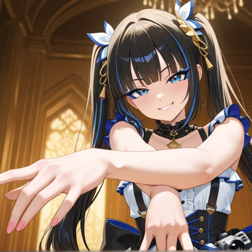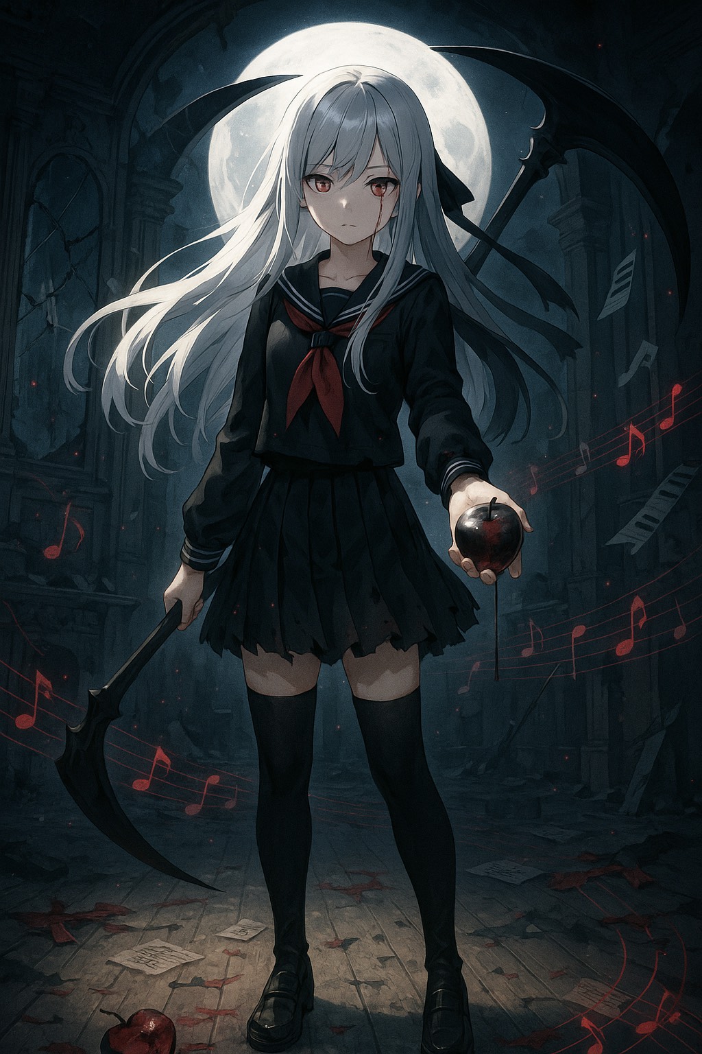 Dark pop with a cute and twisted Yandere idol vibe, High-pitched "moe" voice, sweet on the surface but hiding venom, Catchy synths, creepy toy-like piano, and a heavy bass, Perfect for a villainous anime ending