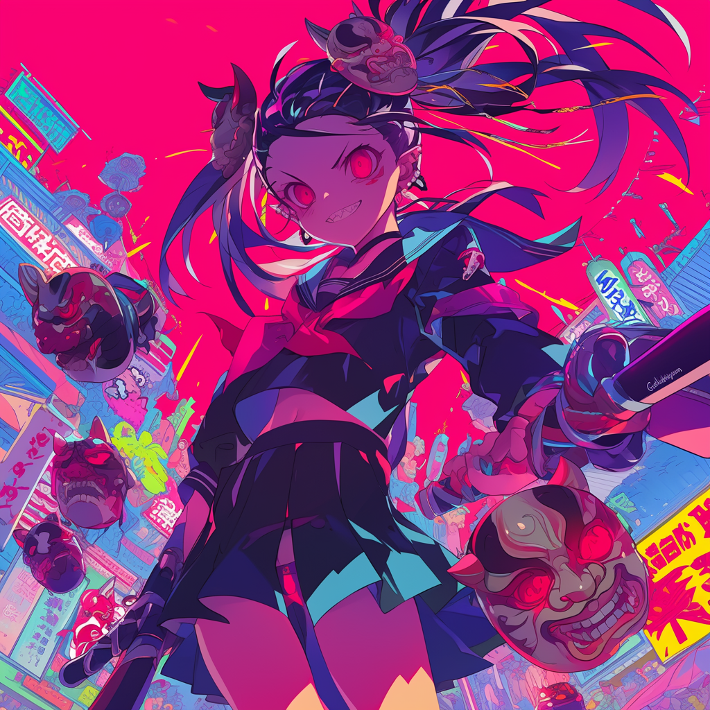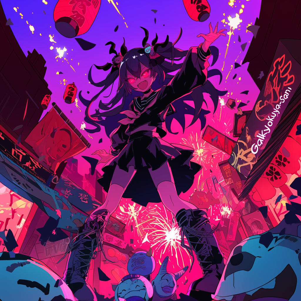 Led by a bold female vocalist, this intense, high-tempo J-pop track is brimming with chaotic dark pop energy, The performance, which alternates between cheeky lines, rapid-fire syllables, eerie whispers, and sudden, high-pitched screams, is playful yet intense, blending comedic and gothic edges, The instrumentation blends pounding taiko drums, distorted shamisen riffs, koto barrages, and festival flute sounds with heavy bass, glitchy synths, and dark electronic pads, The sound evokes a festive yet shadowy, chaotic festival atmosphere, Call-and-response chants like "Hey!", "That!", and "Yes, yes, yes!" are complemented by claps and echoes, amplifying the carnival-like frenzy, The chorus erupts with firework-like electronic bursts that collide with distorted guitars, brass stabs, and glitches, Sudden pauses, tempo changes, and dramatic breaks add to the insane atmosphere, It's manic, colorful, and sinister at the same time, with a minor-key melody and eerie chorus that creates a carnival