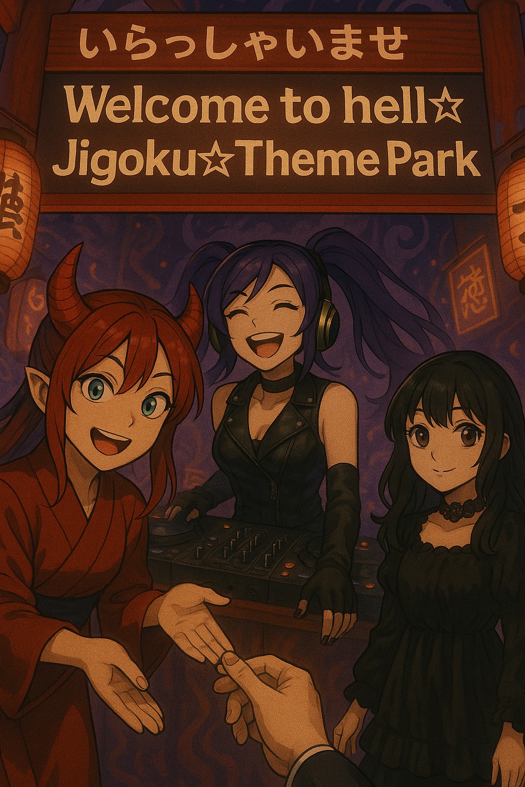 Dark pop rock × glitch idol fusion featuring 7 distinct female vocalists, SoLa: breathy, ghostly voice, emotional swells, KoBo: sarcastic, snarky delivery with theatrical tone and rap lines, Kana: pure, sweet tone for lead melodies, Magu: robotic, low-pitched, fast rap, Fuku: warm, mature harmonies, Kiriko: whispery and venomous, Honfan: powerful diva-style vocals for climax, Lyrics mix Japanese with English, Theme is a hellish amusement park — ironic, theatrical, surreal, Vocal arrangement includes solo lines, layered choruses, glitch FX, whispers, and crowd chants, Instrumentals: distorted guitars, jazzy bass, punchy drums, Japanese taiko & hyoshigi for accent, Tempo: 138 BPM, Mood: eerie, energetic, satirical
