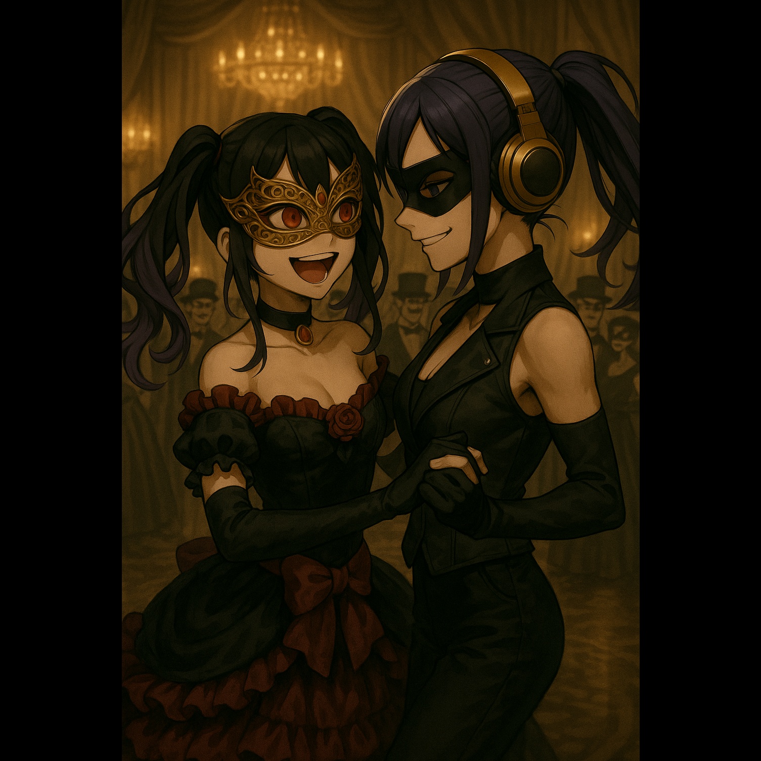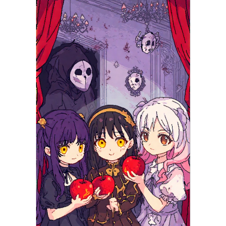 Glitch EDM fused 8-bit horror gaming chiptune with eerie retro arcade sound design, Glitchy synths, distorted 1-bit percussion, creepy music box-like piano riffs, Haunted waltz rhythm with sarcastic energy, Female vocals with 3 alternating styles: cheeky and loud (KoBo), calm and sarcastic (SoLa), clear and intense (TiFa), Layered vocals with delay, distortion, whisper, Bilingual lyrics in Japanese and English, BPM 150, key A minor, Masquerade and poison apple fairy-tale themes with horror game tension