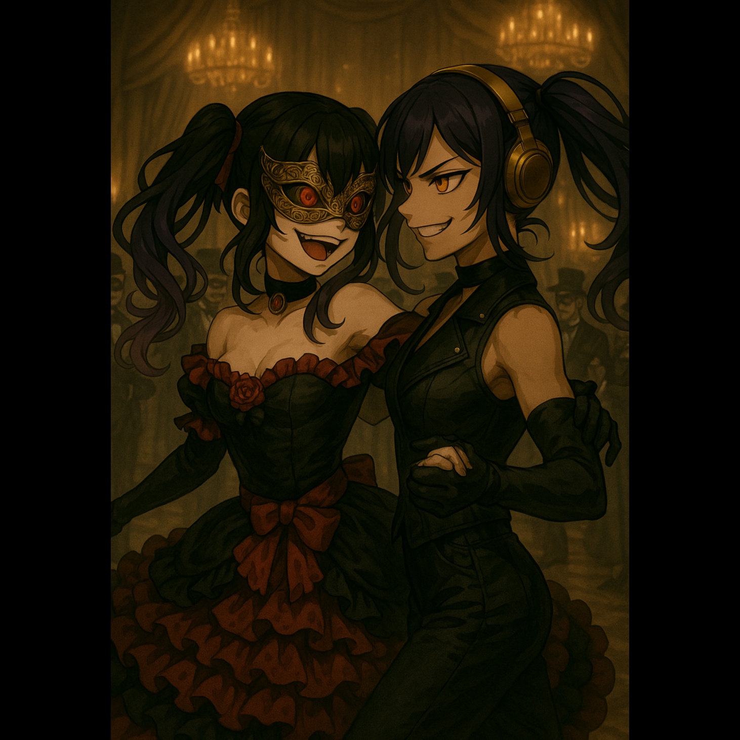 Duet, Two female vocals, A dark theatrical fusion of gothic rock and glitchy lo-fi EDM, featuring distorted guitars, dramatic classical piano, analog modular synths, and haunting string layers, Dual female vocals: one with operatic Japanese-English emotional delivery (à la Ado), the other with distorted, breathy English lines and manic upper register screams, Tempo is medium-fast (BPM 150), with heavy chorus drops and echo delay layers, The sound is twisted, dramatic, and emotionally unstable – like a corrupted fairy tale unraveling through static