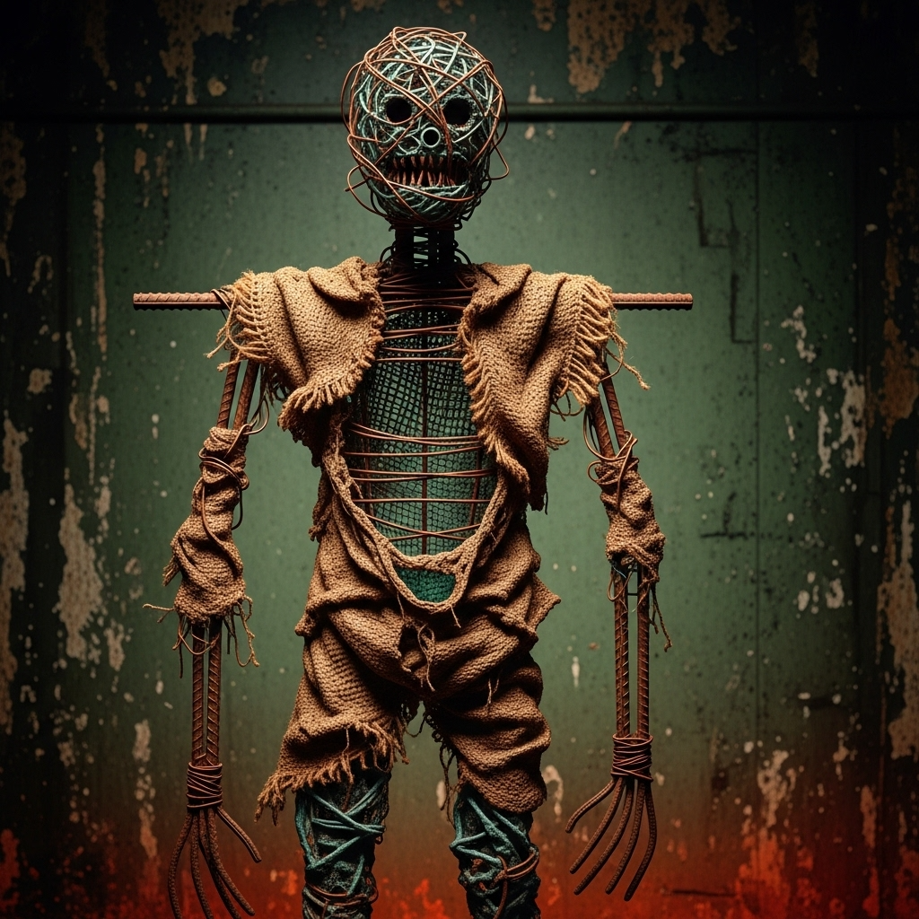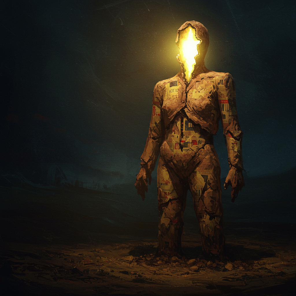 Genre: Industrial Americana blending detuned banjo, pulsing analog synth bass, and clanging metallic percussion, rooted in early 2000s post-industrial aesthetics with minimalist folk-noir production, Vocals: Primary vocalist with weathered, gritty, husky timbre, Inland Northern American accent, employing vocal fry, breathiness, and tight-throated delivery; secondary mob chorus using staccato, chant-like, mechanical harmonies with sprechgesang phrasing, Style: E Phrygian mode at 92 BPM, harmonic palette of Em, G, C, D, Am, B♭, with syncopated kick on beats 2 and 4 and offbeat metallic hits, Dynamics: Begins sparse and intimate with dry, close-mic’d vocals, then layers in distorted textures and rhythmic intensity, culminating in a chaotic, ritualistic final chorus with sudden dynamic drops and vocal layering for frisson, ‑humming intro, ‑hum, ‑vocalise, ‑humming