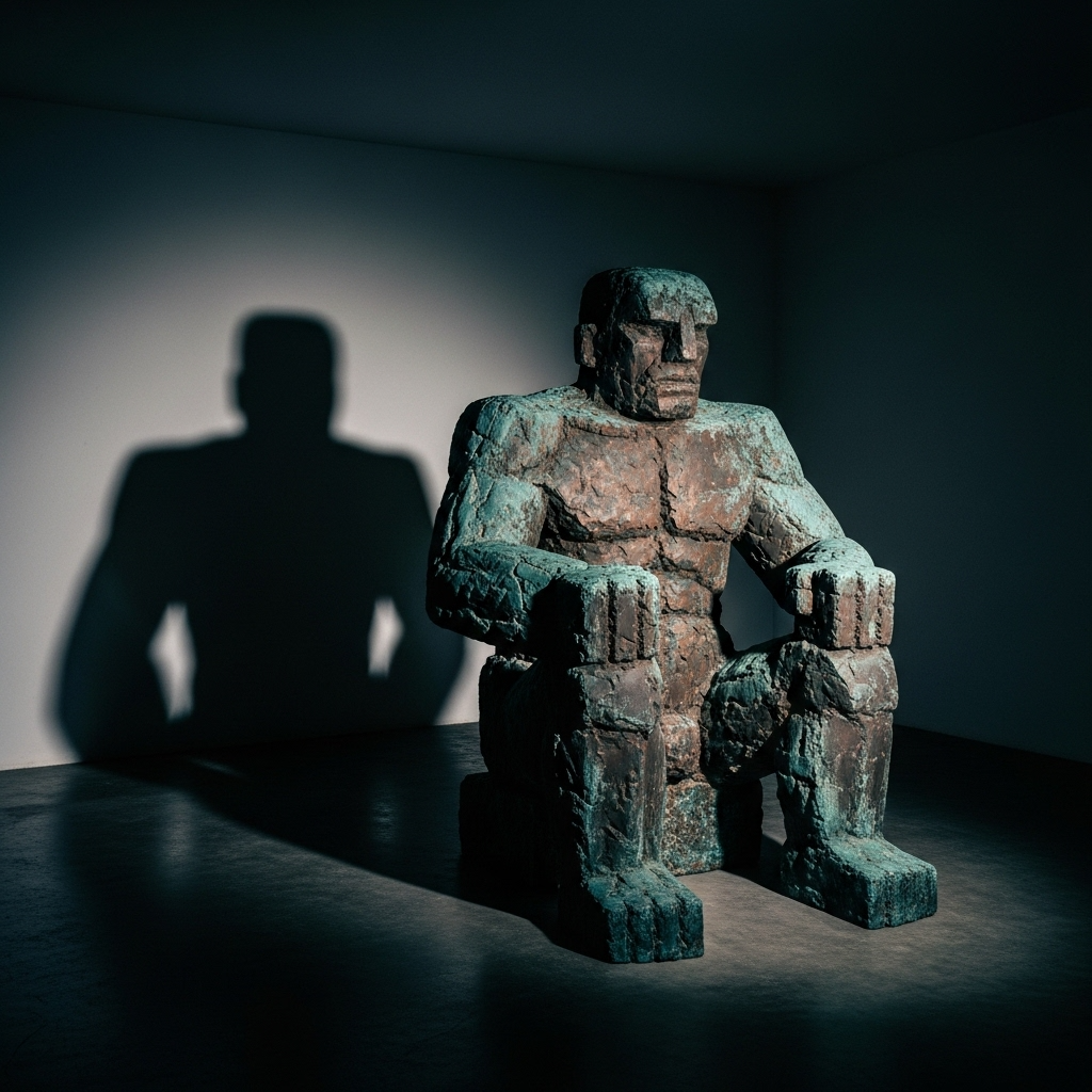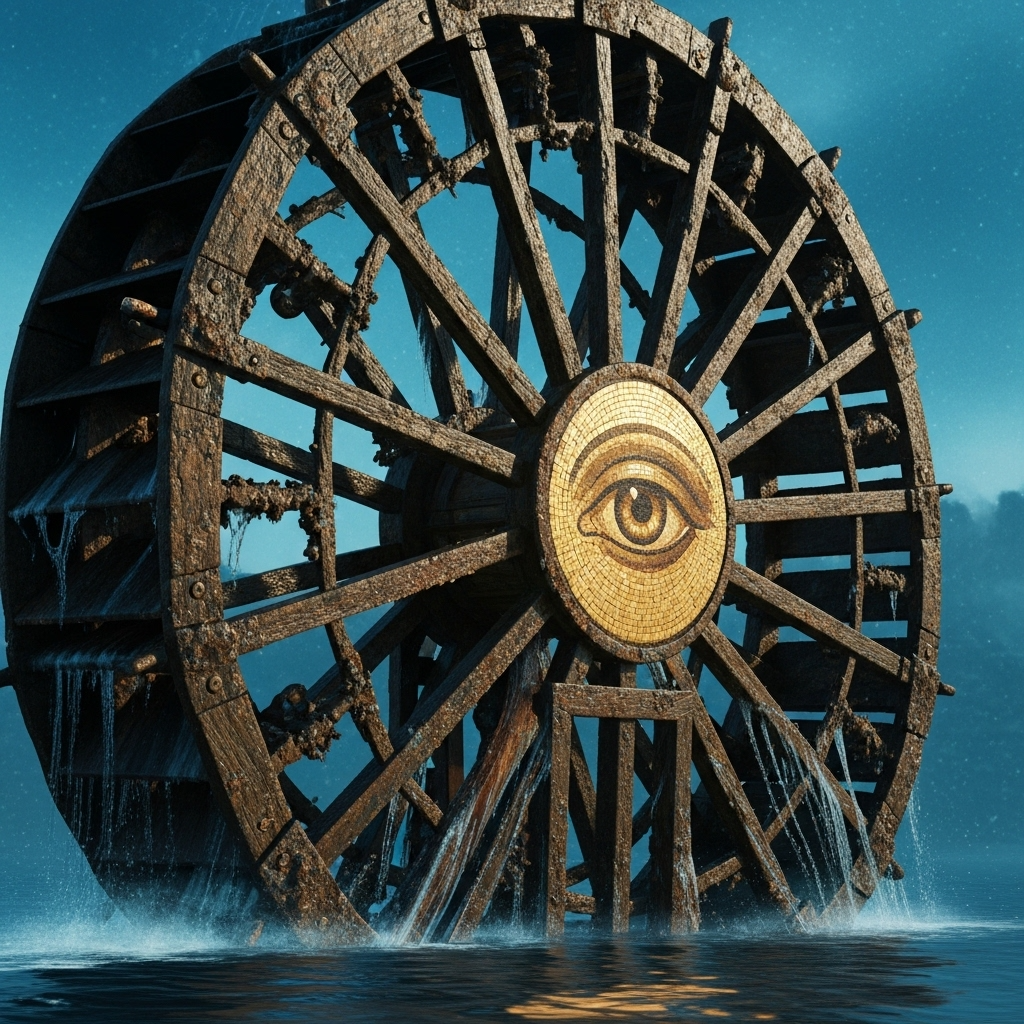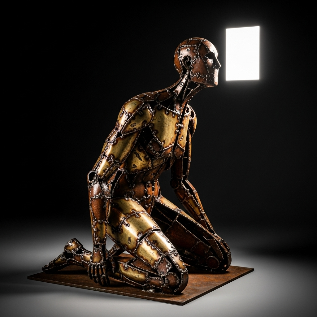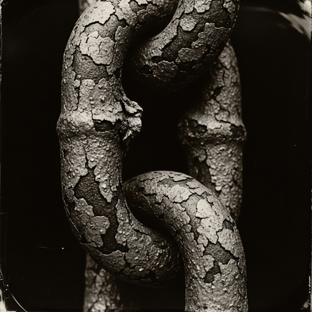 Scrapyard Gospel, A stark, austere, and hypnotic track built on a heavy, distorted bassline and industrial percussion made from found objects like rattling chains and tapped metal pipes, The atmosphere is spacious and raw, with a minimalist lo-fi production, Distant, heavily filtered, and ethereal gospel choir harmonies float behind the lead vocal: a deep, bone-dry, weathered baritone, The vocal performance is deadpanned, declarative, and conversational, delivering profound ideas with an understated, stone-faced serenity