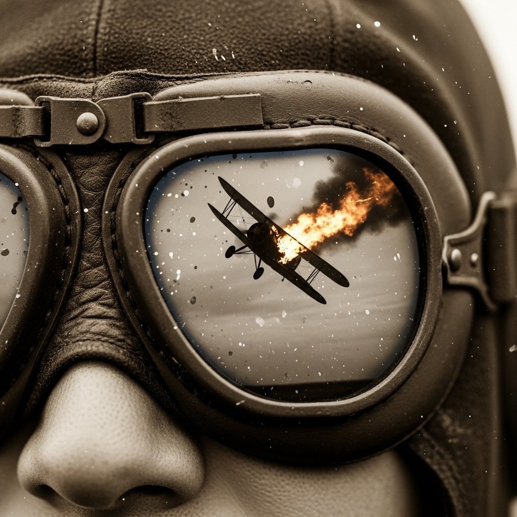 [Style: A visceral collision of dust-bowl acoustics and grinding mechanical noise, The rhythm section is built from samples of misfiring radial engines, metallic clanks, and a heavy, stuttering kick drum that mimics a stalling propeller, The primary instrument is a resonator guitar (dobro) played with aggressive, percussive fingerpicking, sliding through dissonant blues scales with a rusted, metallic timbre, Atmospheric textures include the sound of wind-shear, snapping canvas, and ticking cooling valves, The production is dry and claustrophobic in the verses, exploding into a wide, turbulent wall of sound in the choruses with distorted bass swells, ]
