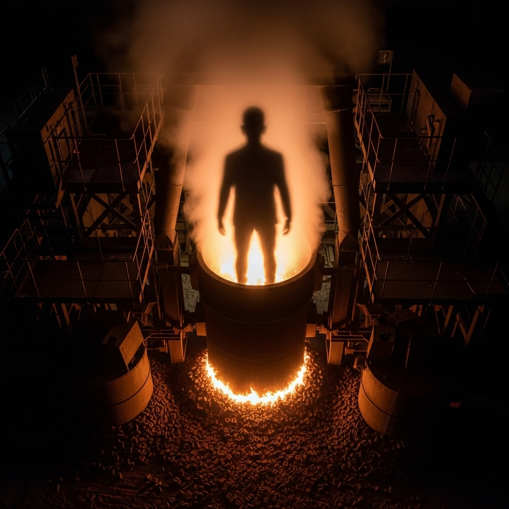 Industrial gospel-stomp at 95 bpm kicks off with intensely dry, close-miked metallic clangs and boot stomps on gravel, layered atop distorted 808s imitating ground quakes, Heavy, aggressive percussion and mid-heavy snare attack drive the scrapyard groove, Vocals slash with brassy, cracked sprechgesang and commanding group shouts—staccato, percussive, spat and belted, compressed till visceral, Low reverb; everything cut to sound up-front, with high-mid frequencies piercing and sustained bass drum decay anchoring the march, ‑humming intro, ‑hum, ‑vocalise, ‑humming, ‑intro