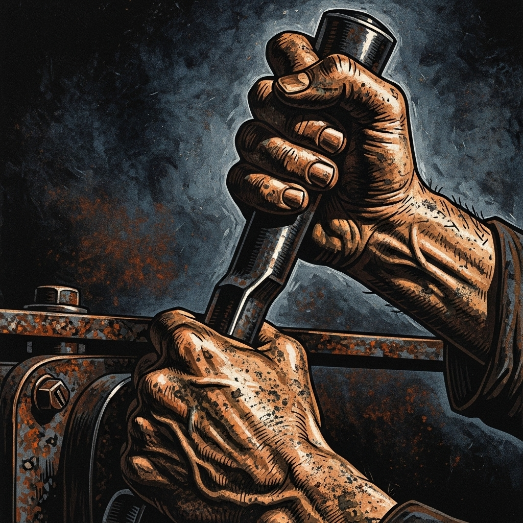 Industrial Swamp Rock, Stomp-Blues, Alt-Country, 85 BPM, heavily distorted slide guitar riffs that mimic revving engines, mechanical percussion using stomps and metallic gate latches for snares, aggressive fuzzy bass creating a muddy low end, dry production with zero reverb to enhance intimacy, tense atmosphere, brooding energy, visceral texture, raw instrumentation, syncopated groove, heavy downbeat emphasis, jagged rhythm guitar, howling harmonica in the background, cinematic tension builder, explosive choruses with layered low-octave harmonies, gritty sonic landscape, adrenaline-fueled tempo shifts, [Grit vocals: sandpapery, smoke-damaged, weathered, resonant, heavy, dry, glottal fry, abrupt stops, straining on high notes, breathy exhales, gravelly low register, behind-the-beat delivery, deadpanned phrasing, menacing tone, punchy articulation, raw emotional weight, snarling attitude, throat-shredding intensity, vocal cracks on the belt, unpolished and authentic performance], ‑humming intro, ‑hum, ‑vocalise, ‑humming, ‑intro