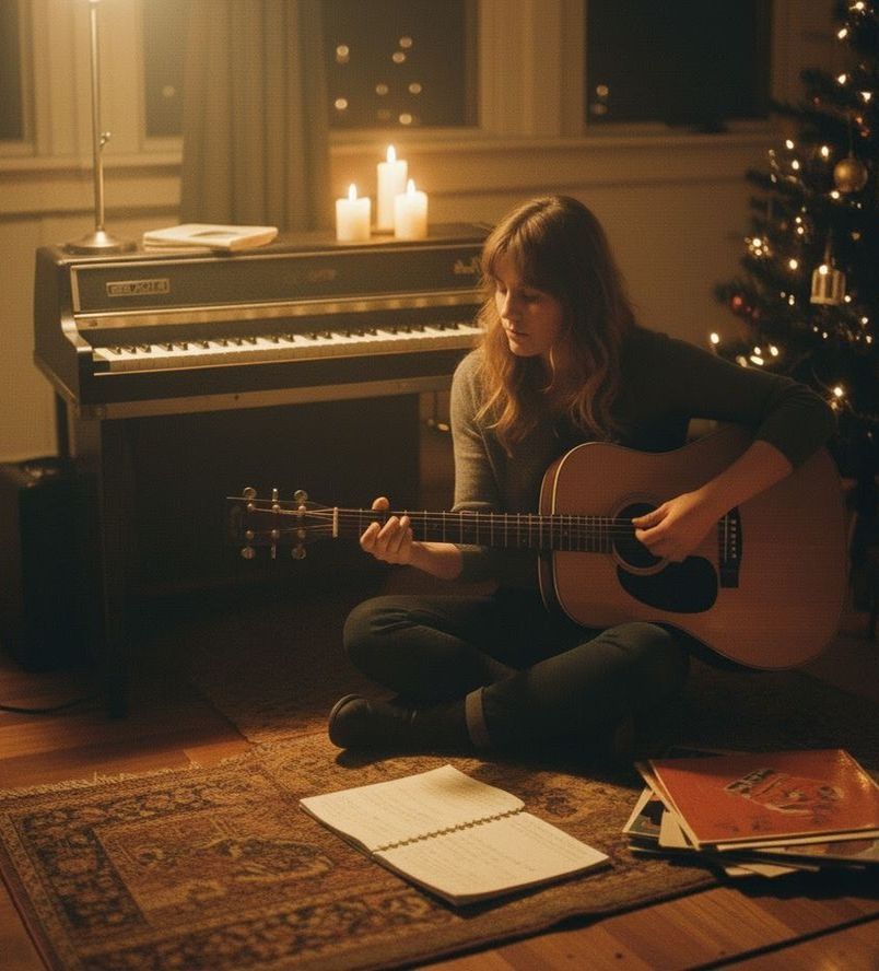 80s pop Christmas ballad, nostalgic and warm, synth-pop style, dreamy atmosphere, female lead vocal with emotion, layered harmonies, bright synth pads, jingle bells accents, soft 80s drums, light piano arpeggios, sentimental chill pop vibe, 65-70 BPM