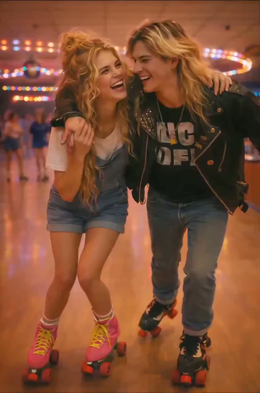Fun, carefree, playful, sweet, energetic, neon, summer night, roller rink vibes, good times only, From a woman’s point of view Having fun rollerskating with friends, drinking milkshakes
