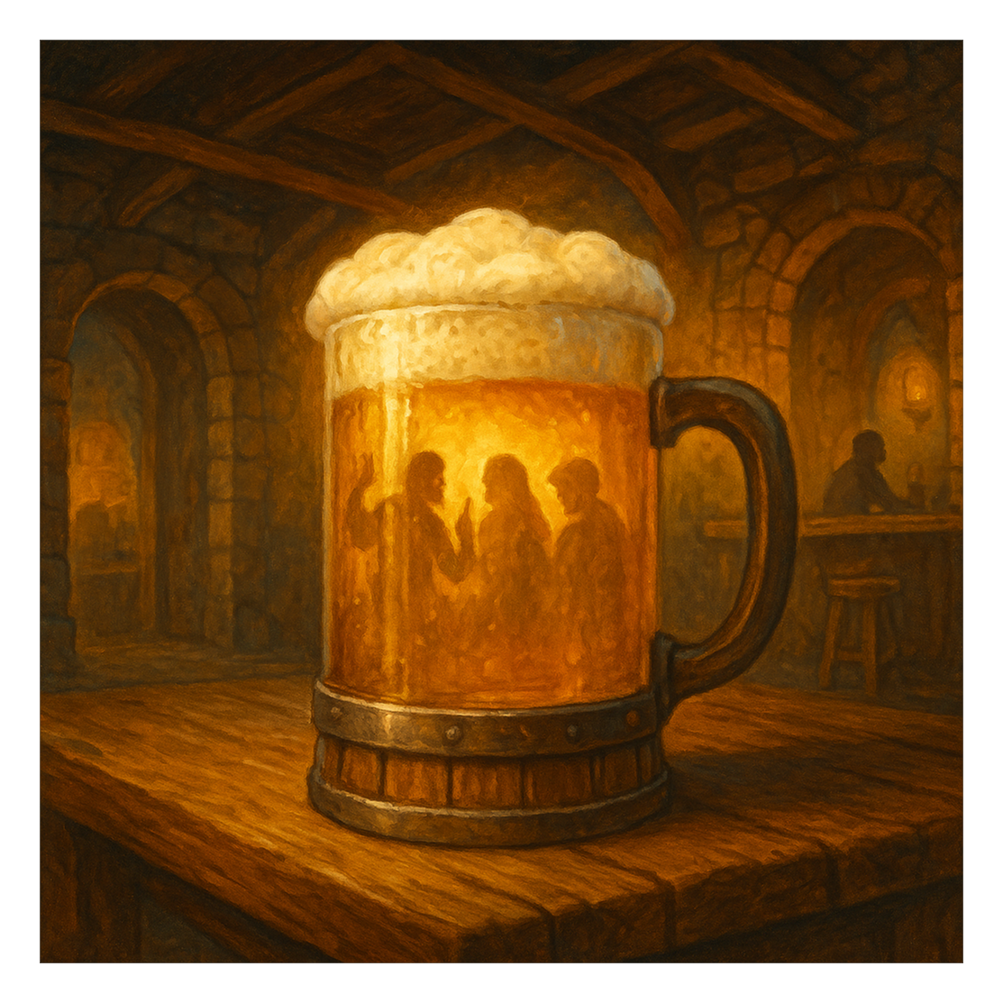 Instruments: Acoustic guitar, harp, folk strings, choir pads, tribal percussion, soft synth textures, tavern crowd ambience, hand drums
