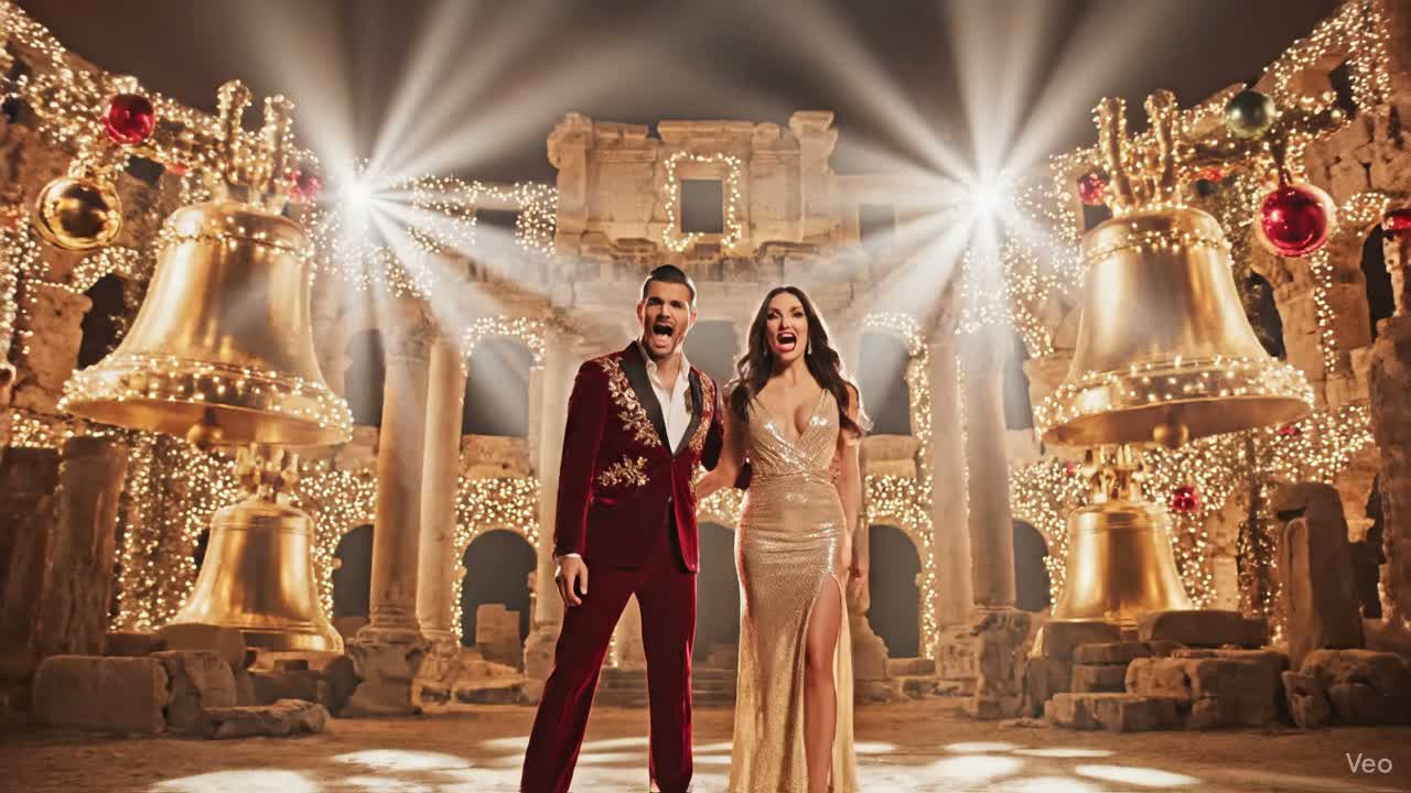 A Christmas pop song with a moderate tempo and a major key, The instrumentation includes a full drum kit with a prominent kick and snare, a bass guitar providing a walking bass line, acoustic guitars playing strummed chords, and a piano adding melodic fills and harmonic support, A string section provides lush pads and counter-melodies, particularly during the chorus, The lead vocals are performed by a female singer with a clear, bright tone, often harmonized with male backing vocals, The song features a call-and-response section between the lead female and male vocalists, The song structure follows a typical pop format with verses, pre-choruses, and choruses, along with a bridge and an outro, The production is clean and polished, with a balanced mix that highlights the vocals and melodic instruments, The overall mood is uplifting and festive
