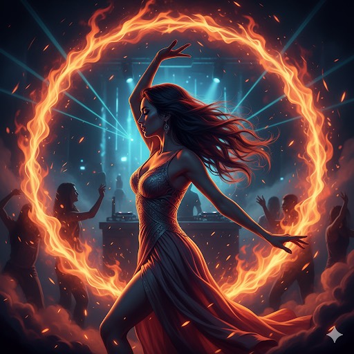 High-energy EDM / Club Banger with Pop and Dance influences, • Rhythm: 4/4, fast tempo (~124–128 BPM), punchy kick, crisp hi-hats, heavy side-chained bass, • Drums: Deep electronic kick, snares, claps, energetic build-ups and drops, • Instruments: Bright synth leads, arpeggiated plucks, layered pads, sub bass, FX risers and sweeps, • Vocals: Female lead vocal (confident, fiery, playful), doubled with harmonies in the chorus, • Atmosphere: Explosive, euphoric, dance-floor energy — designed for big club sound systems, • Special FX: Fire/ignite sound effects, vocal chops, crowd-like shouts in drops, • Final: Climactic festival-style outro with synth stacks, powerful beat, and lingering vocal echoes