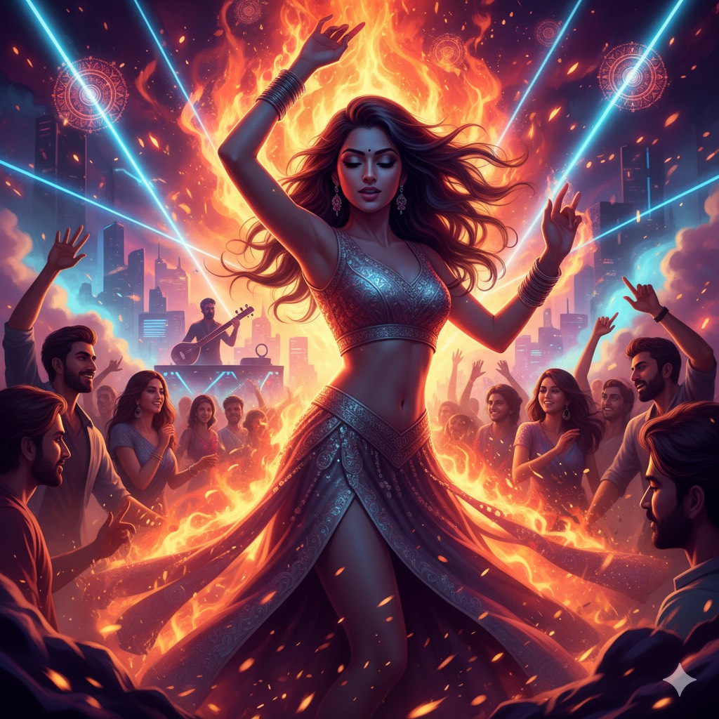 Bollywood Modern Pop Remix With Edm And Bhangra Energy, 4/4 Punchy Club Beat, Heavy Electronic Bass, Dhol Drums, Sitar Samples, Bollywood Strings, Claps, And Energetic Drops, Female Bollywood-Style Lead Vocal In Hindi With Dramatic Emotion, Male Rap Verse In Hinglish With Swagger And Rhythm, Choir Harmonies In The Final Chorus For A Big Cinematic Climax, Fast Tempo (~108 Bpm), Party Atmosphere, Hands-In-Air Vibe, Club-Ready Mix