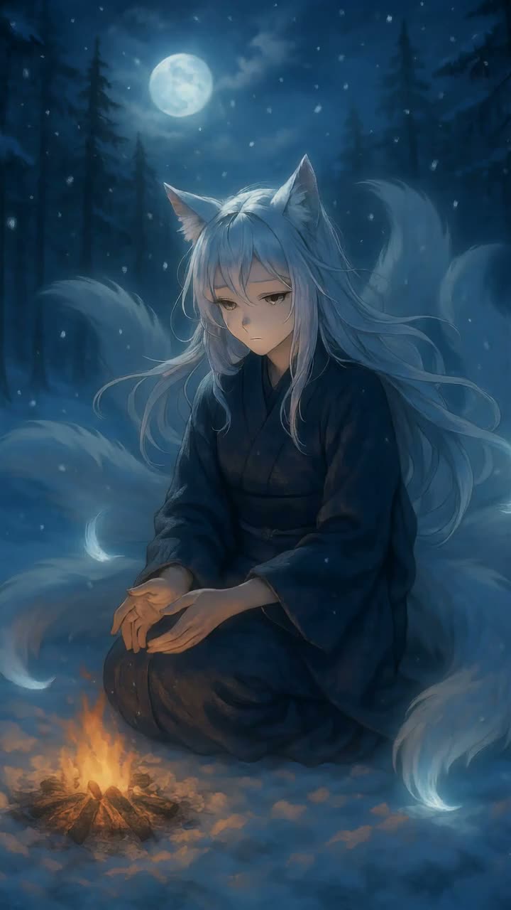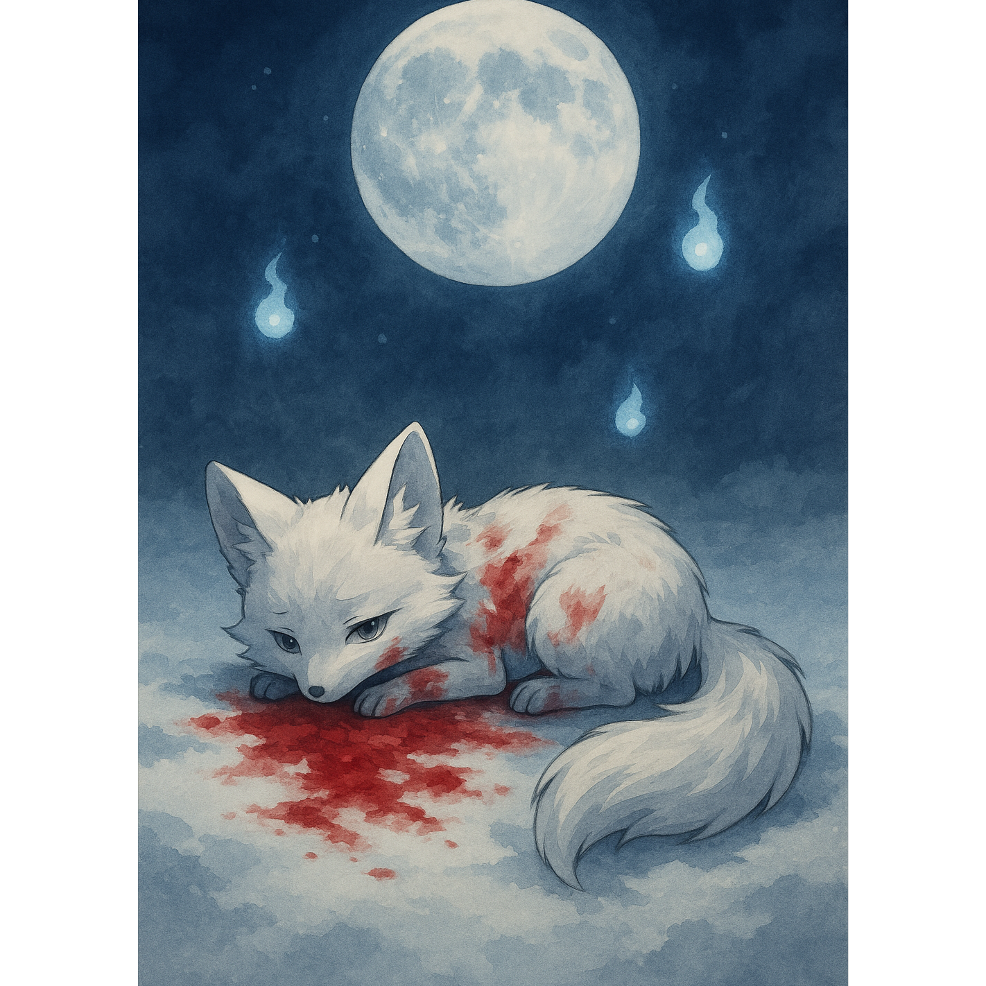Dark Japanese folk + cinematic, Full female vocal only:Sing in a low, whispering style → powerful in the chorus, Vibe: cold, mystical, vengeful kitsune in winter village, Shakuhachi, kokyū, soft taiko, suzu bells, icy ambient wind, Tempo slow–mid (70–92 bpm), Verses: quiet, breathy, eerie; minimal instruments, Chorus: powerful layered vocals, blue foxfire feeling, shimmering bells, deep taiko, Verse2: darker, sensual tension, Verse3: onmyoji investigation mood, airy pads, Bridge: intimate whispers + rising tension, Verse4: cinematic rise, Outro: wind + soft humming, Overall: sacred, dangerous, tragic beauty