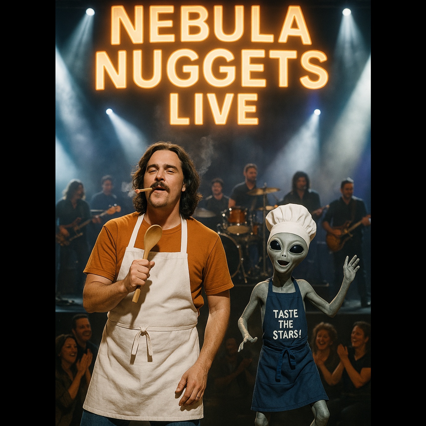 Live concert with crowd, concert hall, live performance, (cheers), (crowd singing), Orchestral, Male live concert, Live Band, A humorous intergalactic cooking song duet between two slightly crazy space chefs, One “a deep, smooth voice, like a cosmic lounge singer in the style of soulful baritone voice iconic in RnB, The other voice is high-energy, quirky, and a bit nerdy – like a hyperactive sci-fi cook, Musical style: funky retro synthwave meets playful old-school hip-hop, with sound effects like sizzling plasma, bubbling antimatter, and spaceship beeps, Includes spoken word parts delivered like dramatic Captain’s Log entries or strange recipe instructions, The whole vibe is charmingly chaotic, funny, and full of spaced-out personality Make it feel like a musical comedy sketch from another galaxy, Duet, Male vocals only, Genre Tag:Funky Synthwave / Sci-Fi Hip-Hop ComedyMood Playful, Weird, Retro-Futuristic, Energetic