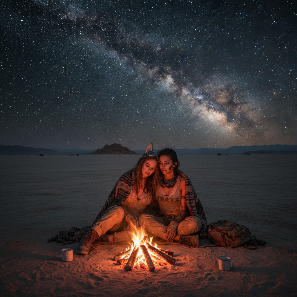 Soft emotional desert ballad with subtle cyberpunk atmosphere and light industrial textures, Gentle clean guitars, warm balalaika plucks, airy synth pads like desert wind, and a slow heartbeat pulse, Add faint metallic ambience, soft glitchy echoes, and low neon-like hums in the background, Female vocals only, intimate, warm, breathy, Verses calm and spacious, pre-chorus with a soft lift, chorus slightly wider with gentle harmonies and repeating “free in your arms” hook, No heavy drums, no aggressive EDM, Peaceful, cinematic, two lovers resting by a fire in a futuristic wasteland night
