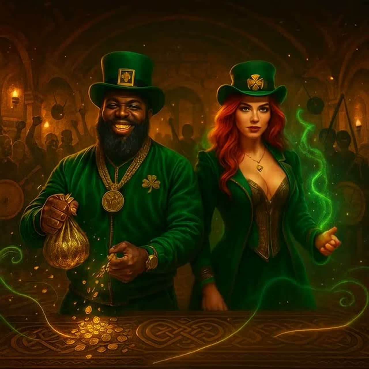 Create a high-energy Irish Folk Trap track with bodhrán-inspired kick patterns, tight 808 subbass, crisp snare rolls, and distorted Celtic percussion, Add low fiddle drones, bright tin-whistle riffs, mandolin chops, and rowdy Irish pub crowd shouts to build a traditional tavern atmosphere, Vocals should feature a deep male Irish-accented rap, rhythmic and storytelling, layered with Gaelic female chants and shouted male group refrains, The mood is rowdy, ancestral, humorous, and triumphant—mixing classic Irish folk melodies with modern trap punch, Warm analog reverb, spacious fiddles, punchy low end, and centered vocals complete the sound