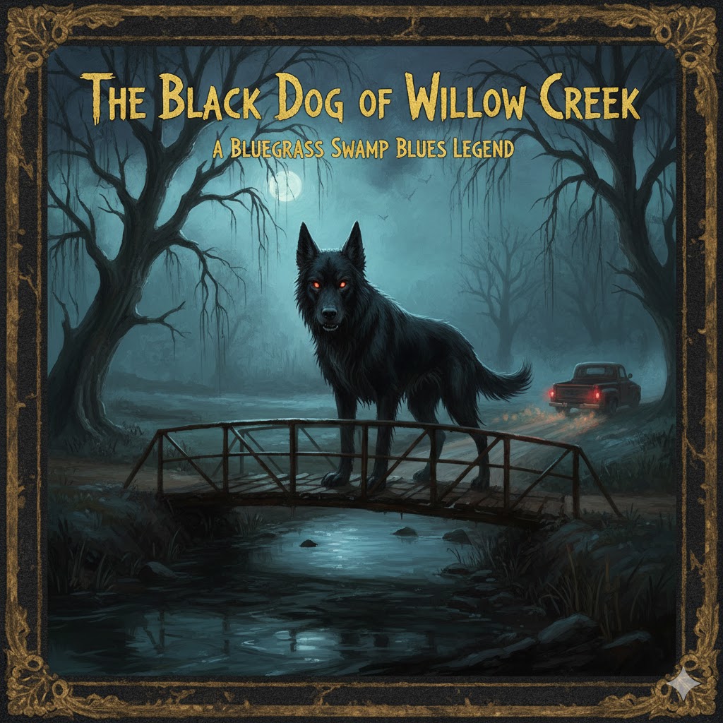 Bluegrass Swamp Blues Fusion, Gritty Male Vocal, Heavy Slide Guitar, Fast Banjo, Shuffling Drum Beat, Dark, Storytelling