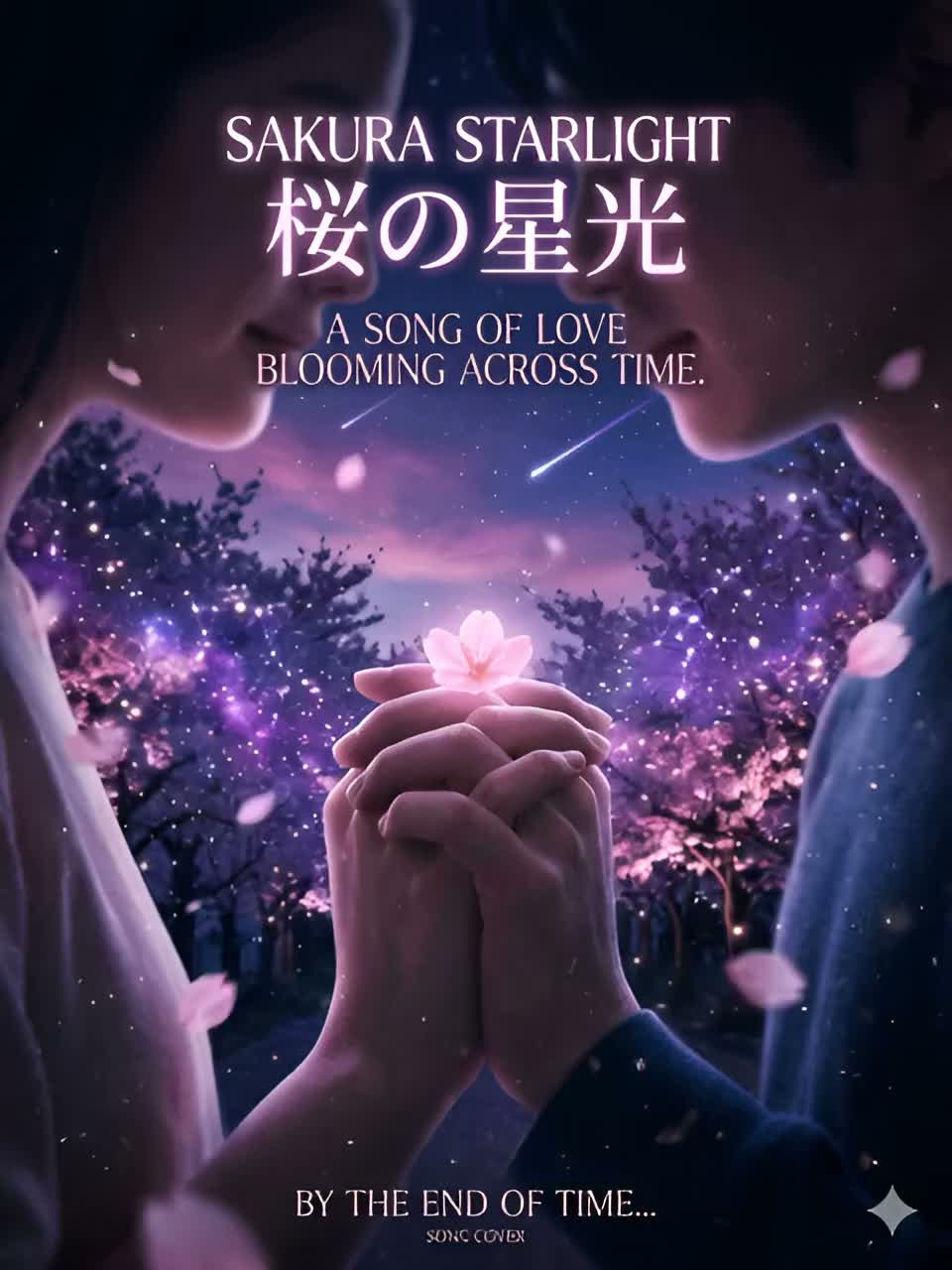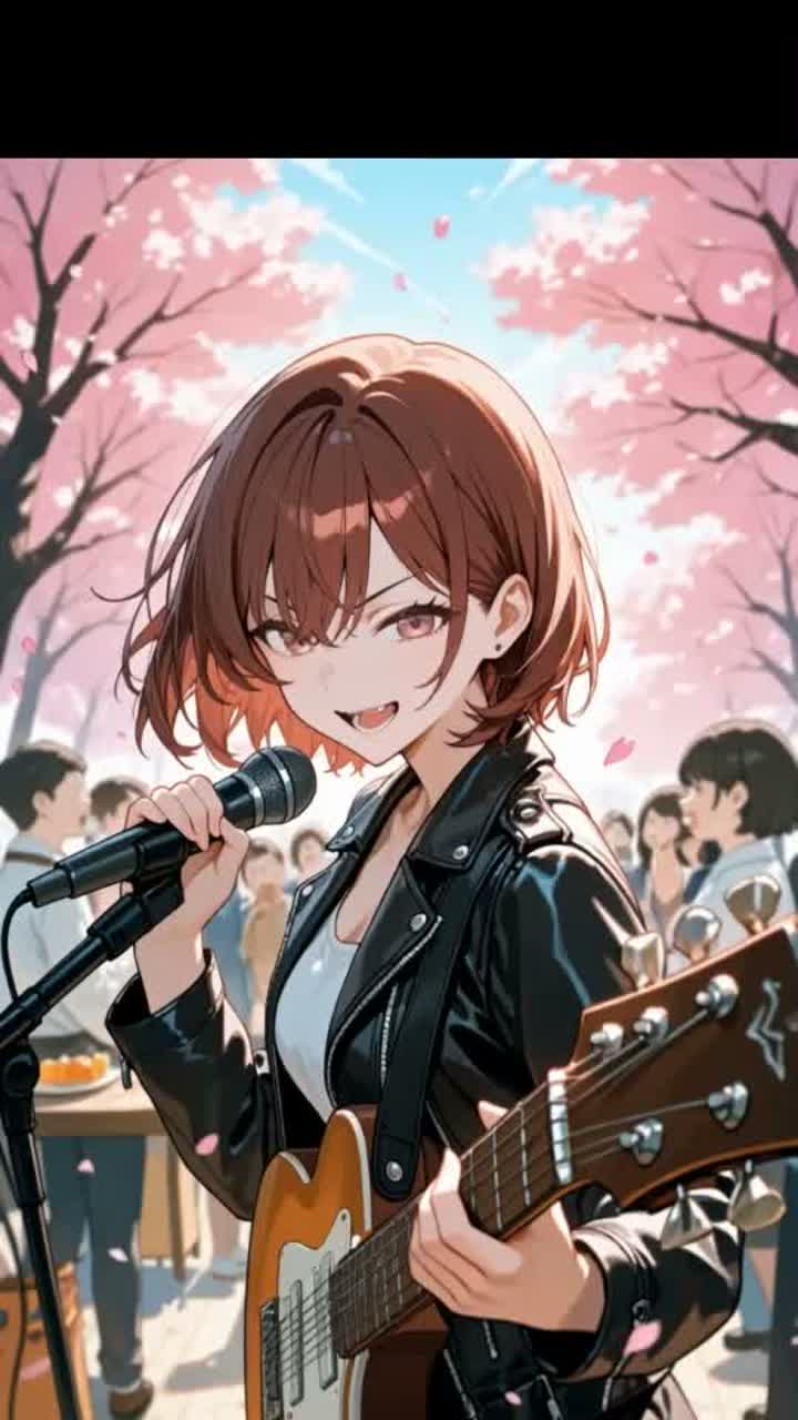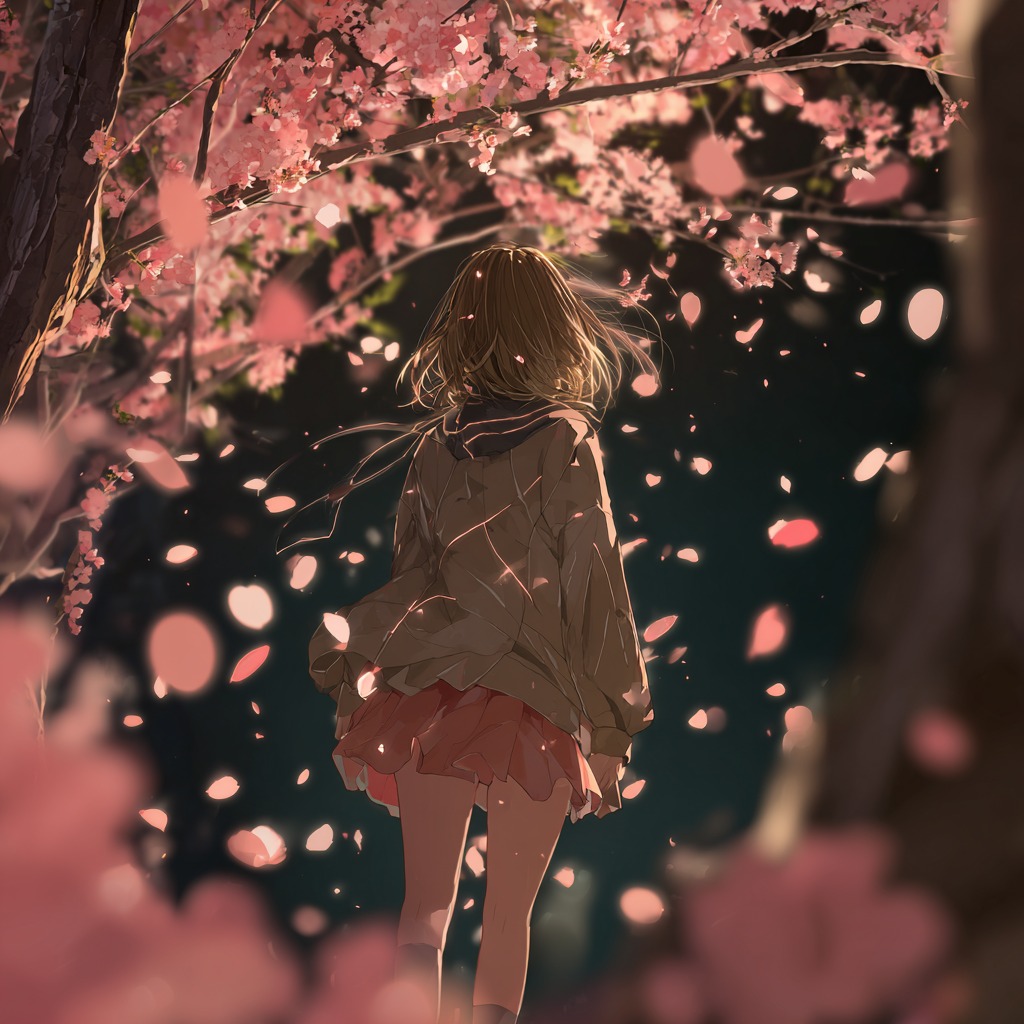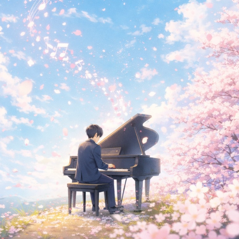Emotional Japanese spring rock ballad with a nostalgic and slightly melancholic atmosphere, Male vocal with a clear, expressive and slightly airy tone, youthful yet emotional, capable of soft delicate verses and powerful dramatic choruses, Medium tempo (92–100 BPM), Intro begins with clean electric guitar with delay and gentle piano, creating a dreamy and cinematic atmosphere, The arrangement gradually builds with acoustic guitar layers, warm melodic bass and spacious rock drums, Verses feel intimate and atmospheric, focusing on melody and emotional storytelling, The chorus opens wide with uplifting rock energy, layered electric guitars, rich harmonies and strong drums while maintaining a sentimental and elegant feeling, Atmosphere romantic, cinematic and slightly mystical, like standing under falling cherry blossoms at dusk with petals drifting in the wind, Style modern Japanese melodic rock, dramatic, elegant and emotional with a strong sing-along chorus