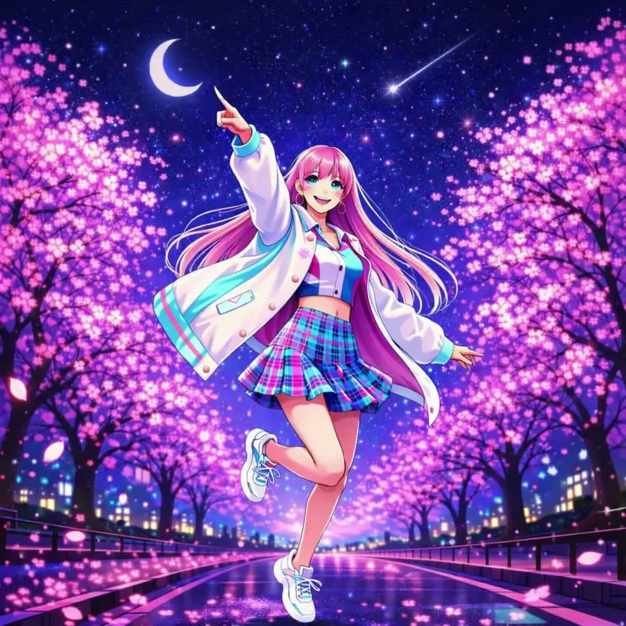 Future funk, cute J-POP, house, trap beats, 125bpm, Vocal style: Sassy, playful high-pitched female vocals, mischievous whispering delivery, cheeky and cute tone, energetic and confident enunciation, intimate close-mic placement, breathy vocals with a hint of a smile, Melody you'll find yourself humming, Rhythm: Tempo variations, heavy thumping 808 bass, punchy rhythmic house claps, groovy snare rolls, syncopated dance beats, Instrumentation: Catchy funky electric guitar riff (with wah and bright tone), sparkling 80s synth, playful glitchy samples, bright felt piano accents, sparkling digital bells, Atmosphere: Vibrant, colorful, cherry blossom petals, bright, mischievous