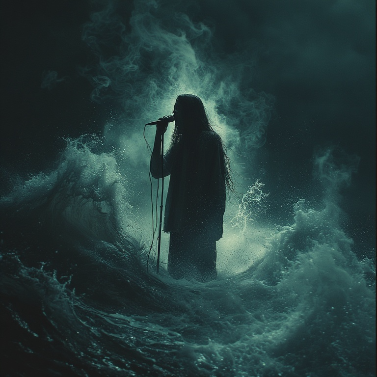 1970s Progressive industrial rock / Trent Reznor witch house ambient, moody, atmospheric, cinematic, space rock, acoustic guitar, electric guitar solo with heavy delay and reverb, Hammond organ, Fender Rhodes, layered vocals, deep male vocalist, tape effects, British, gothic opera metal, large brass bell