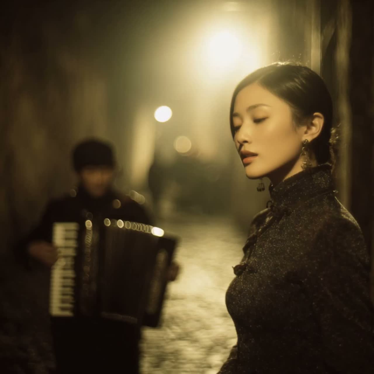 Accordion-led melancholic ballad, vintage accordion as the sole and dominant instrument, intro, accompaniment and interludes entirely performed by accordion, no guitars, no pianos, no drums, no percussion, no additional instruments, no café mood, no street performance feeling, no European folk brightness, slow tempo, minor key atmosphere, soft sustained chords with restrained movement, minimal bass button motion, no lively rhythm, dim late-night indoor setting, solitary and introspective mood, emotionally fragile and nostalgic, accordion played gently with controlled bellows, slightly darker tone, subtle harmonic tension, intimate close-mic female vocal, low register focus, breathy and restrained delivery, clear Mandarin diction, phrases allowed to linger in silence, bridge almost suspended in air, lonely, reflective, tender sadness, no brightness, no warmth of a café, deeply personal and inward