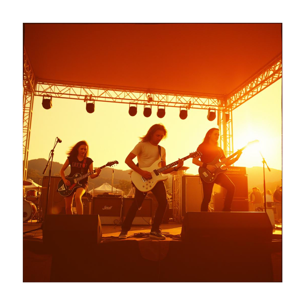 Fast punk rock with snarling vocals, distorted guitars, hard-hitting drums, high-energy, make vocals