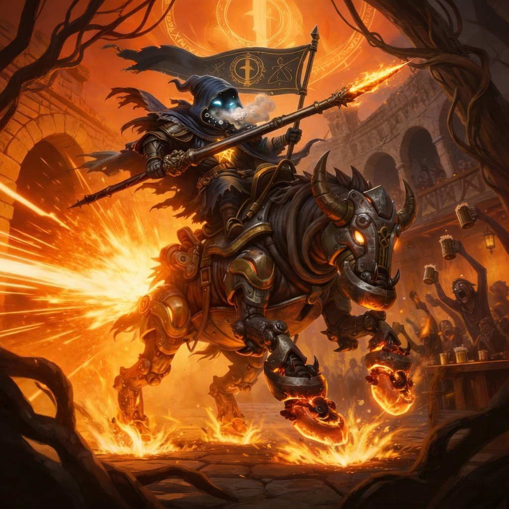 Outlaw Country, Rockabilly, Country Metal, Western Metal, Southern Metal, High Energy, Fast Tempo, piano, deep baritone electric guitar, singing, saxophone, swinging horns, heavy bass, double kick drums, cowbell