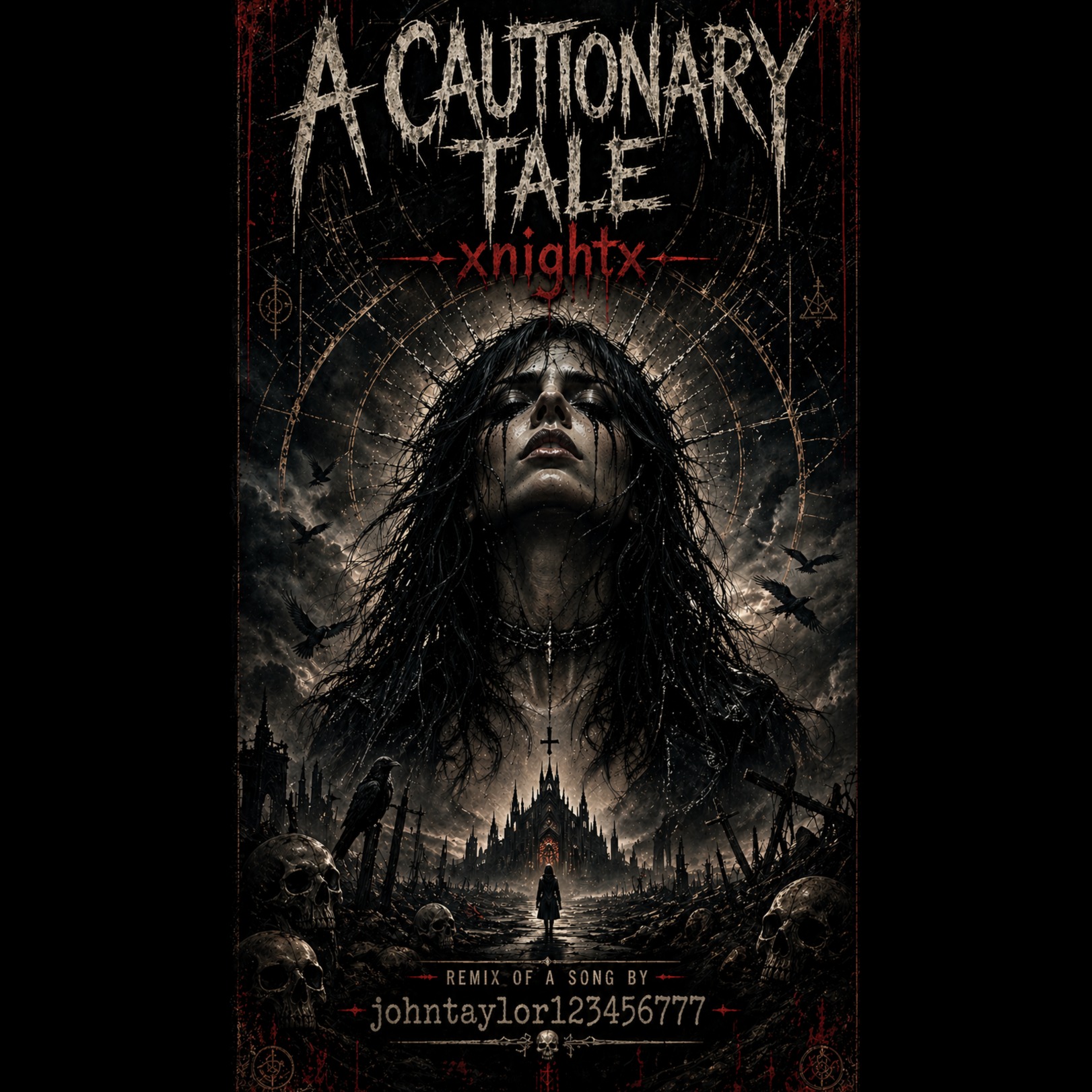 atmospheric blackened death metal; tortured layered screams, low demonic growls, and whisper-chanting; icy tremolo riffs, cavernous blast beats, doom-drenched breakdowns, and cold droning dissonance; eerie choir pads and haunting bells behind a wall of frost-bitten guitar distortion; tone is ritualistic, surreal, prophetic, and unholy; themes of ink-vision madness, divine decay, fractured identity, and cosmic judgment; massive reverb, bleak ambience, and sudden drops into whispered void-rituals before explosive returns