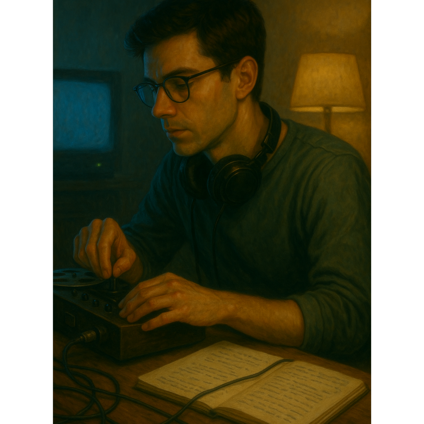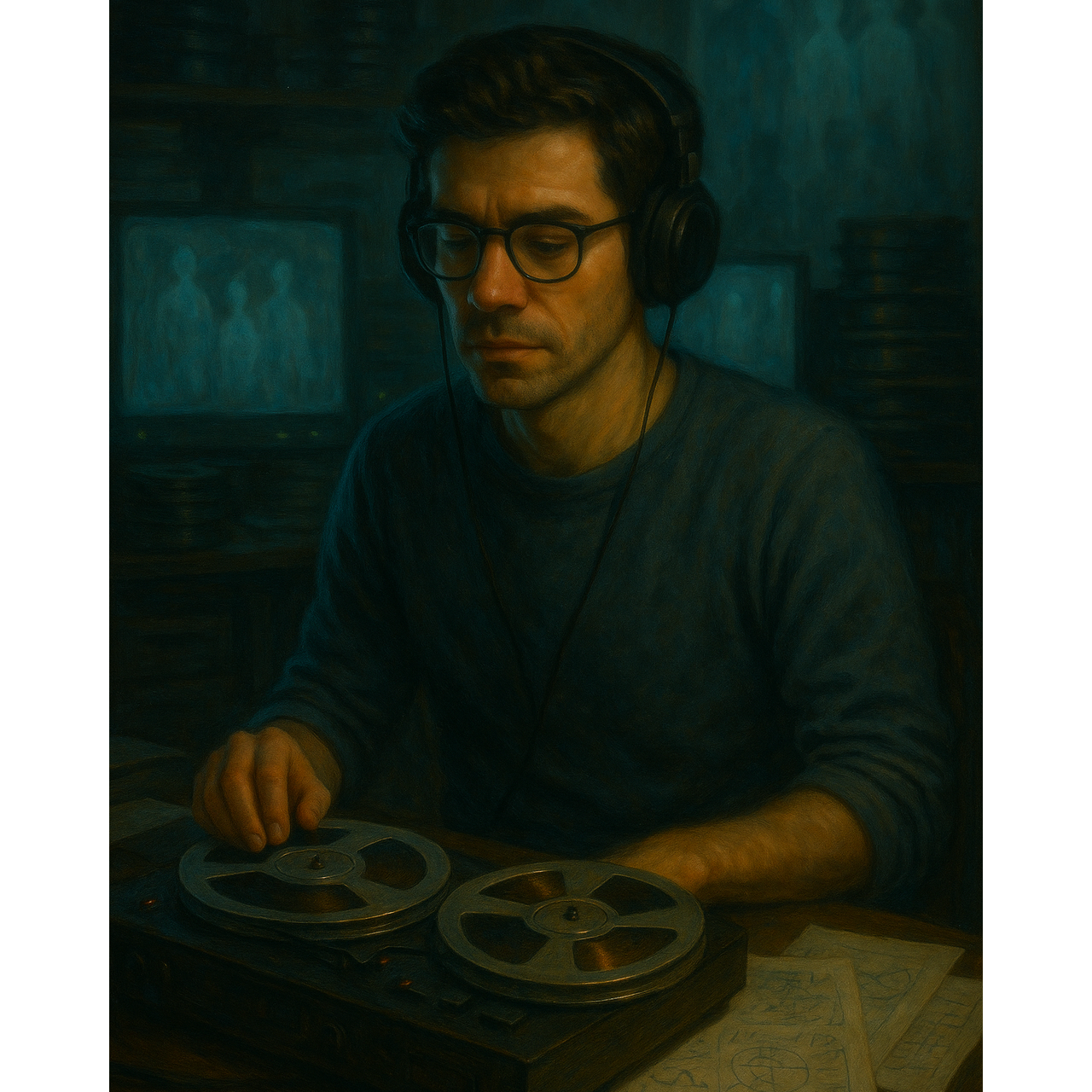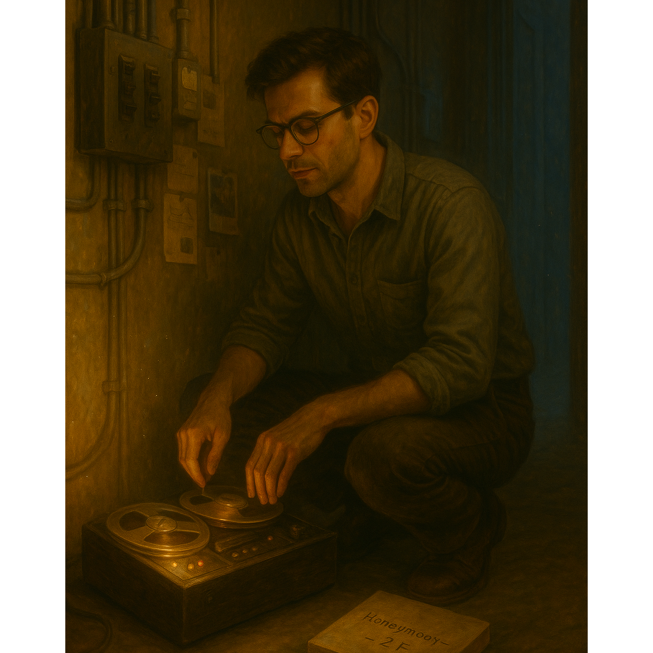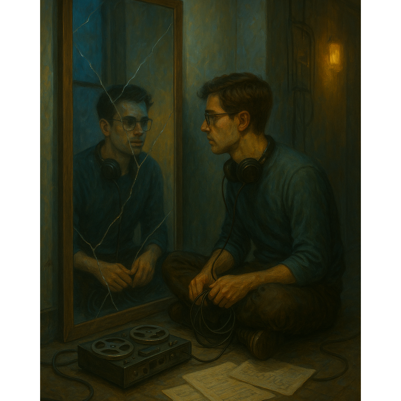 Cinematic electronic ambient-techno (112 BPM, key E minor), Male spoken-sung vocal in close mic tone, calm and introspective, with short rhythmic delay tail, Analog bass pulse, modular arpeggios with stereo delay, soft glitch percussion mimicking reel spin and water-drip rhythm, Extended instrumental sections with evolving delay feedback, filtered pad reflections, and mirrored melodic phrases, Captures the sensation of sound reflecting upon itself — introspective repetition and self-dialogue, cohesive with The Building at Number 7 sound world