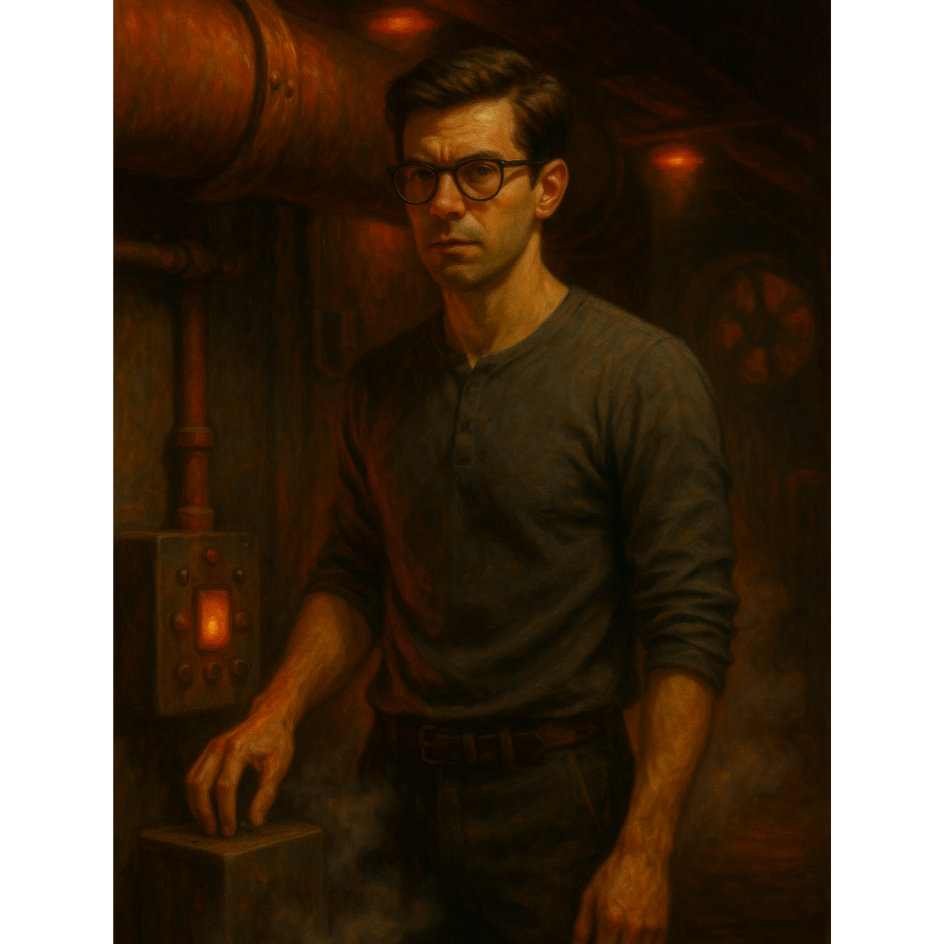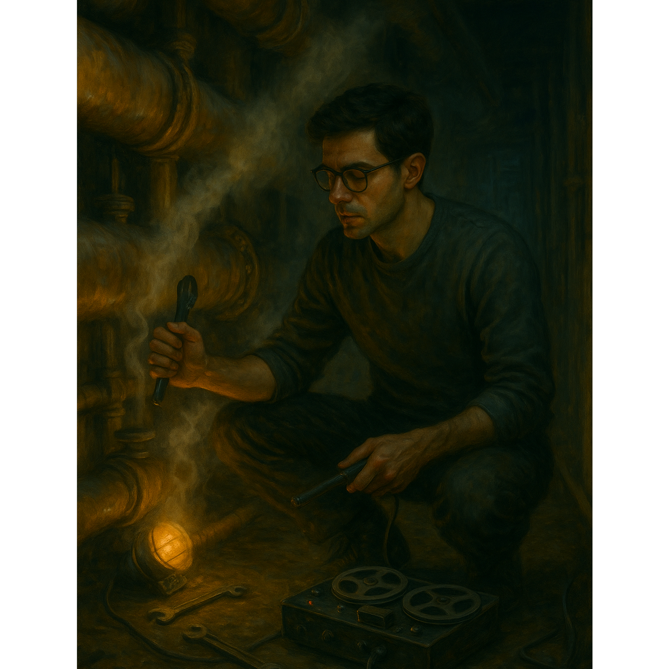 Cinematic electronic industrial-techno (120 BPM, key F minor), Male spoken-sung vocal in close mic tone, steady and calm but rhythmic, Driven by analog bass groove and percussive layers built from tuned metallic hits, water-drip rhythms, and filtered steam-like synth bursts, Features two extended instrumental sections with evolving mechanical percussion and tension-building bass resonance, Captures the feeling of pressure and containment turning into pulse — the Building’s heartbeat through metal — cohesive with The Building at Number 7 sound world
