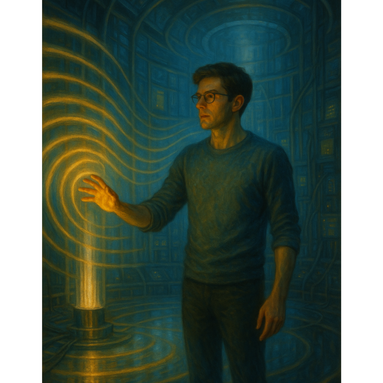 Cinematic electronic ambient-techno (118 BPM, key D minor), Male spoken-sung vocal in close mic tone, calm and grounded, with subtle delay and low-end warmth, Driven by analog bass groove forming deep mechanical resonance, layered modular arpeggios, and evolving pad textures, Percussion built from musical emulation of pipe vibration, elevator cable rhythm, and steady mechanical pressure flow, Includes two instrumental sections highlighting resonance and harmonic overtones, Captures the moment when the Building’s hum becomes music — awareness forming through structure, cohesive with The Building at Number 7 sound world